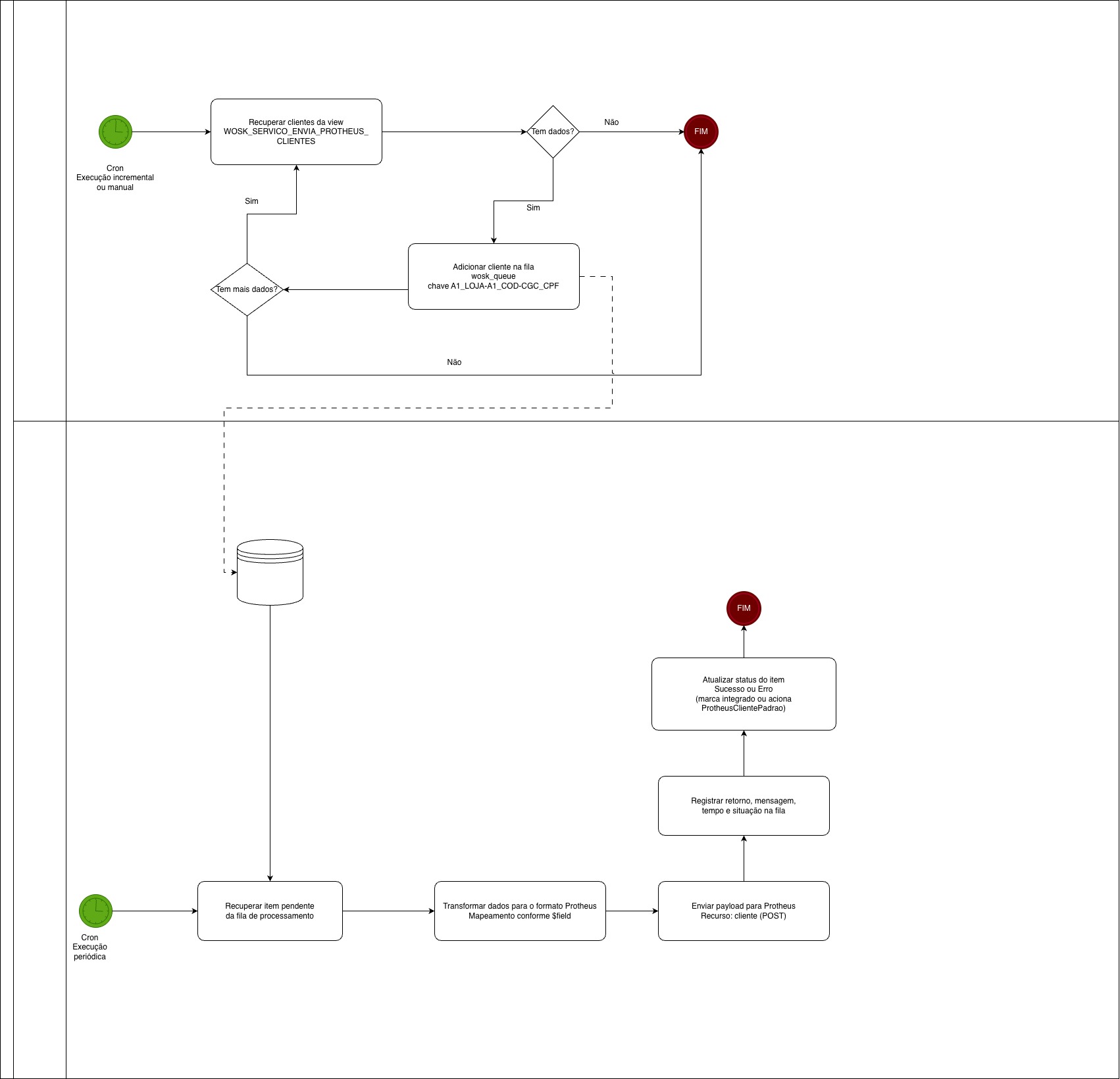 | Capturador | Captura e enfileiramento | Ao recuperar clientes em WOSK_SERVICO_ENVIA_PROTHEUS_CLIENTES e gerar a chave A1_LOJA-A1_COD-CGC_CPF, deve registrar um registro por cliente na fila de processamento para o serviço ProtheusCliente. |
