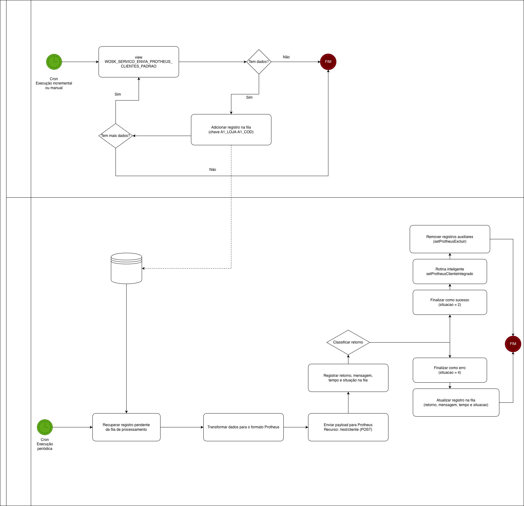 Permite a captura automática (via agendador de tarefas) a origem dos dados é a view WOSK_SERVICO_ENVIA_PROTHEUS_CLIENTES_PADRAO, consultada com projeção predefinida, sendo o filtro por loja (A1_LOJA) e código (A1_COD) aplicado dinamicamente durante a execução. Para cada registro localizado, o conteúdo é encaminhado para a fila de processamento, onde será transformado e posteriormente enviado ao Protheus, mantendo o mesmo padrão de chave para identificação e rastreabilidade do registro na fila.