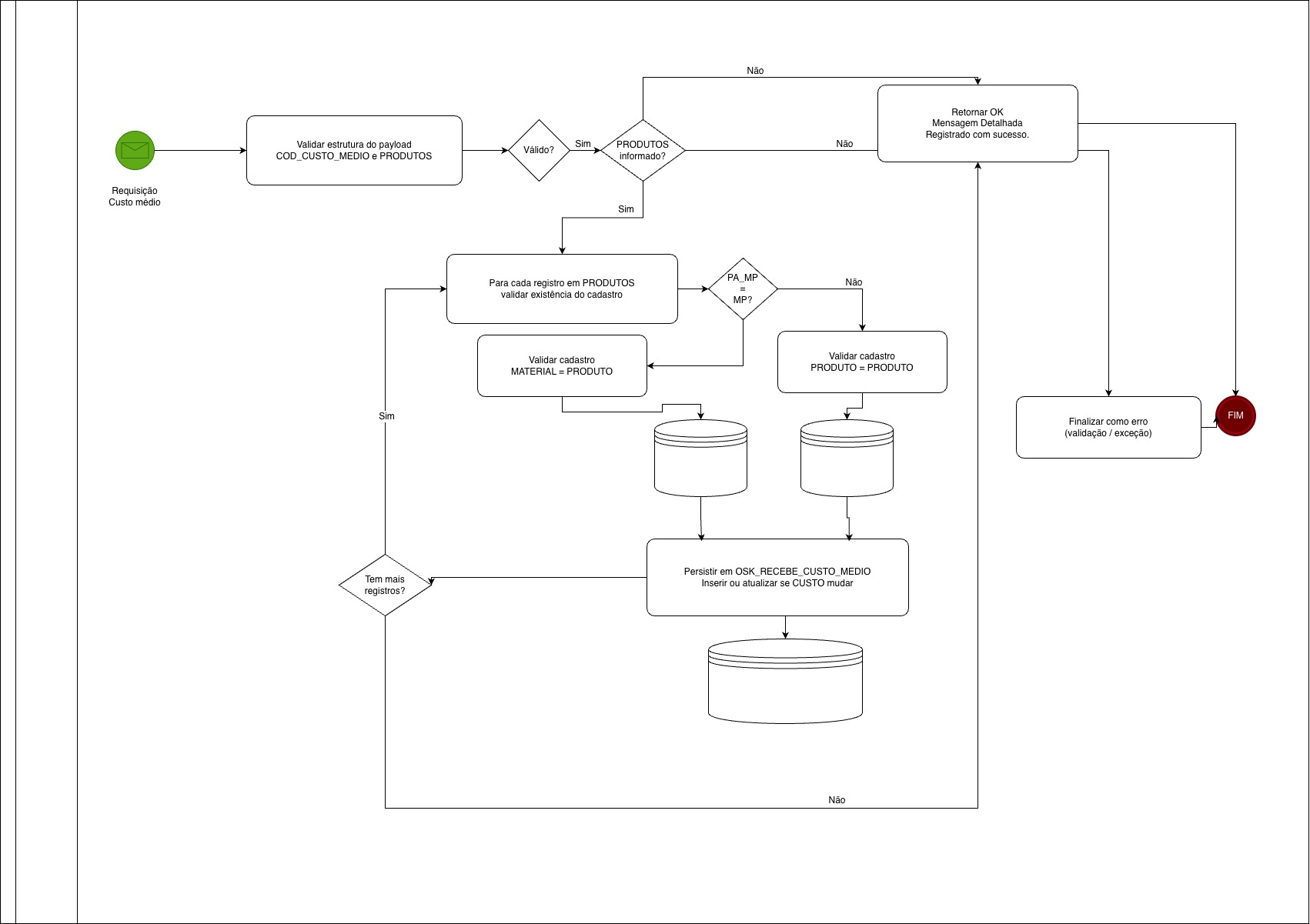 | Endpoint | Persistência de custos | Ao persistir em OSK_RECEBE_CUSTO_MEDIO, deve inserir quando não existir registro para COD_CUSTO_MEDIO + PRODUTO e atualizar apenas quando o valor de CUSTO mudar, garantindo transação por item. |