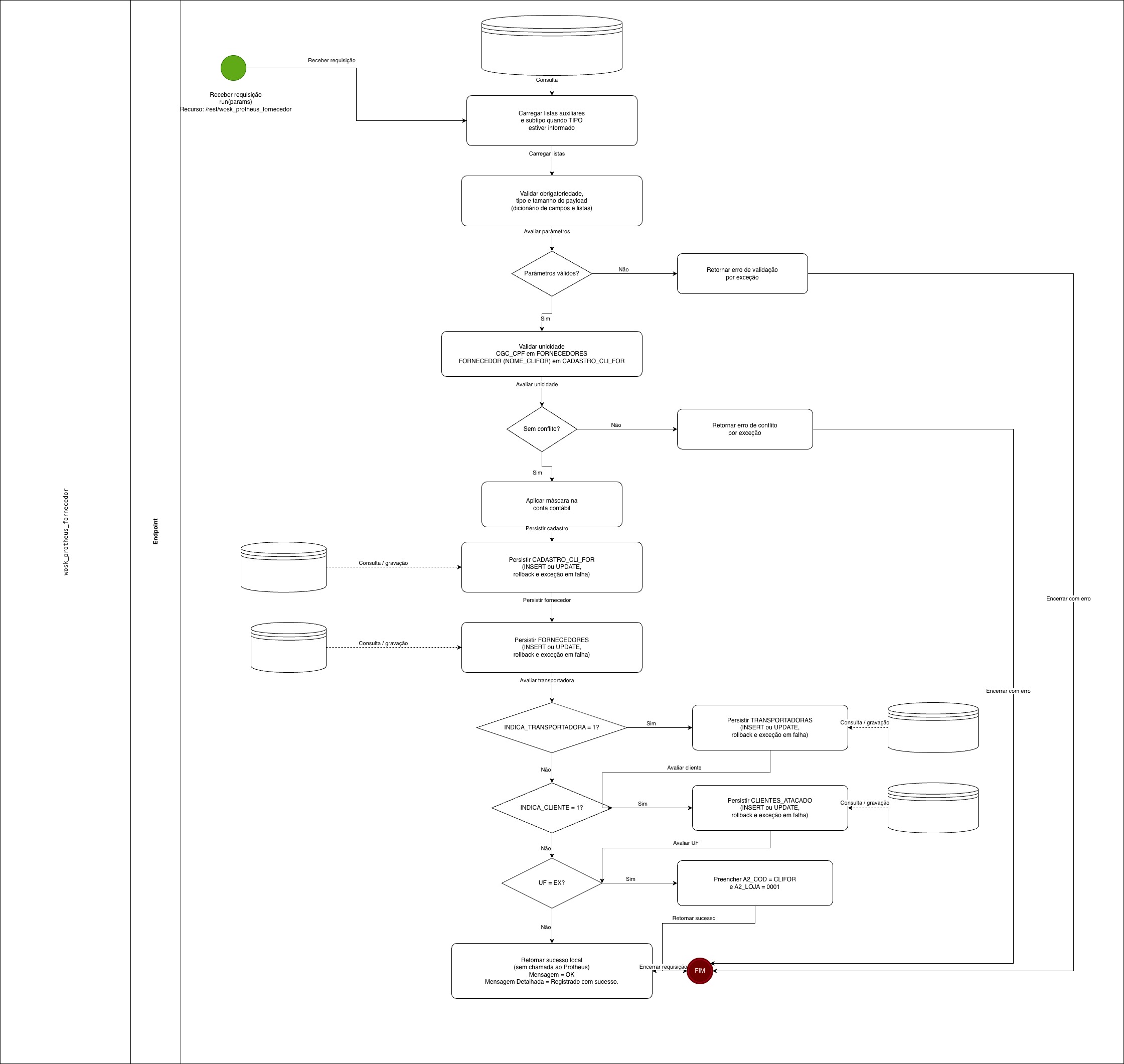 | Endpoint | Persistência e condicionais | Deve criar/atualizar o cadastro base em CADASTRO_CLI_FOR e o cadastro do fornecedor em FORNECEDORES. Quando INDICA_TRANSPORTADORA = 1, deve criar/atualizar em TRANSPORTADORAS; quando INDICA_CLIENTE = 1, deve criar/atualizar em CLIENTES_ATACADO, mantendo transação e rollback por etapa. |