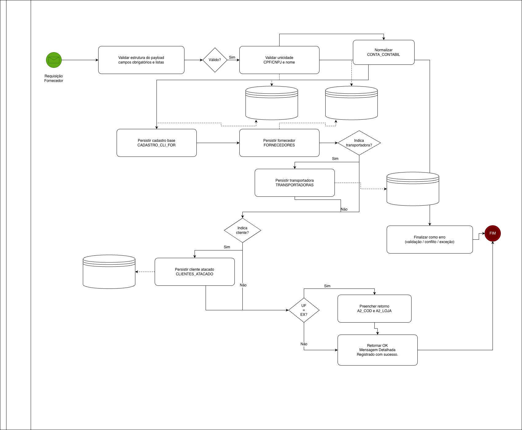 | Endpoint | Persistência e condicionais | Deve criar/atualizar o cadastro base em CADASTRO_CLI_FOR e o cadastro do fornecedor em FORNECEDORES. Quando INDICA_TRANSPORTADORA = 1, deve criar/atualizar em TRANSPORTADORAS; quando INDICA_CLIENTE = 1, deve criar/atualizar em CLIENTES_ATACADO, mantendo transação e rollback por etapa. |