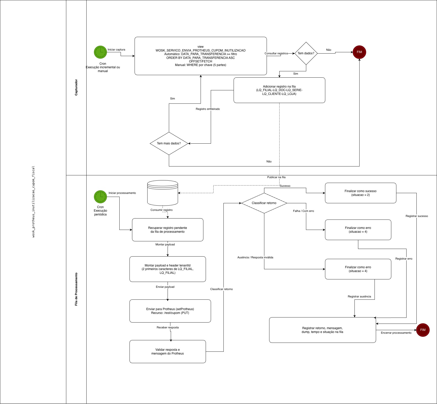 | Capturador | Captura cronológica e controle de posição | Ao consultar a view WOSK_SERVICO_ENVIA_PROTHEUS_CUPOM_INUTILIZACAO com filtro por DATA_PARA_TRANSFERENCIA, ordenação ascendente e paginação por OFFSET/FETCH, deve manter a continuidade por posição persistida em wosk_monitor (evento, offset, chave_posicao, data_posicao, filtro). |