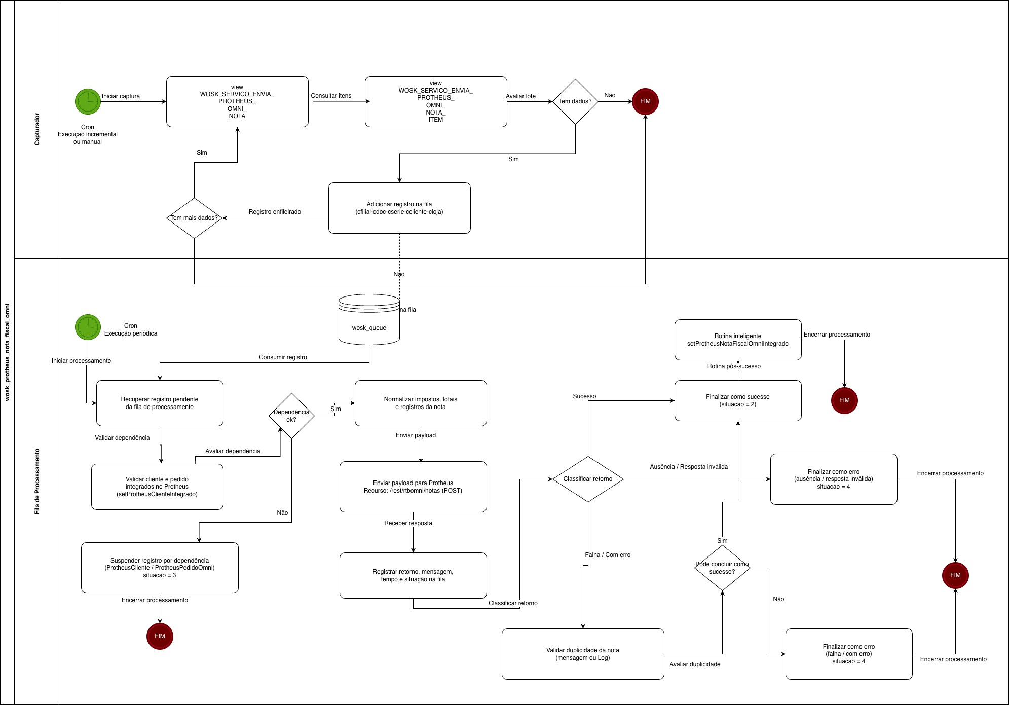 | Capturador | Captura cronológica e controle de posição | Ao consultar a view WOSK_SERVICO_ENVIA_PROTHEUS_OMNI_NOTA com filtro por DATA_PARA_TRANSFERENCIA, ordenação ascendente e paginação por OFFSET/FETCH, deve manter a continuidade por posição persistida em wosk_monitor (evento, offset, chave_posicao, data_posicao, filtro). |