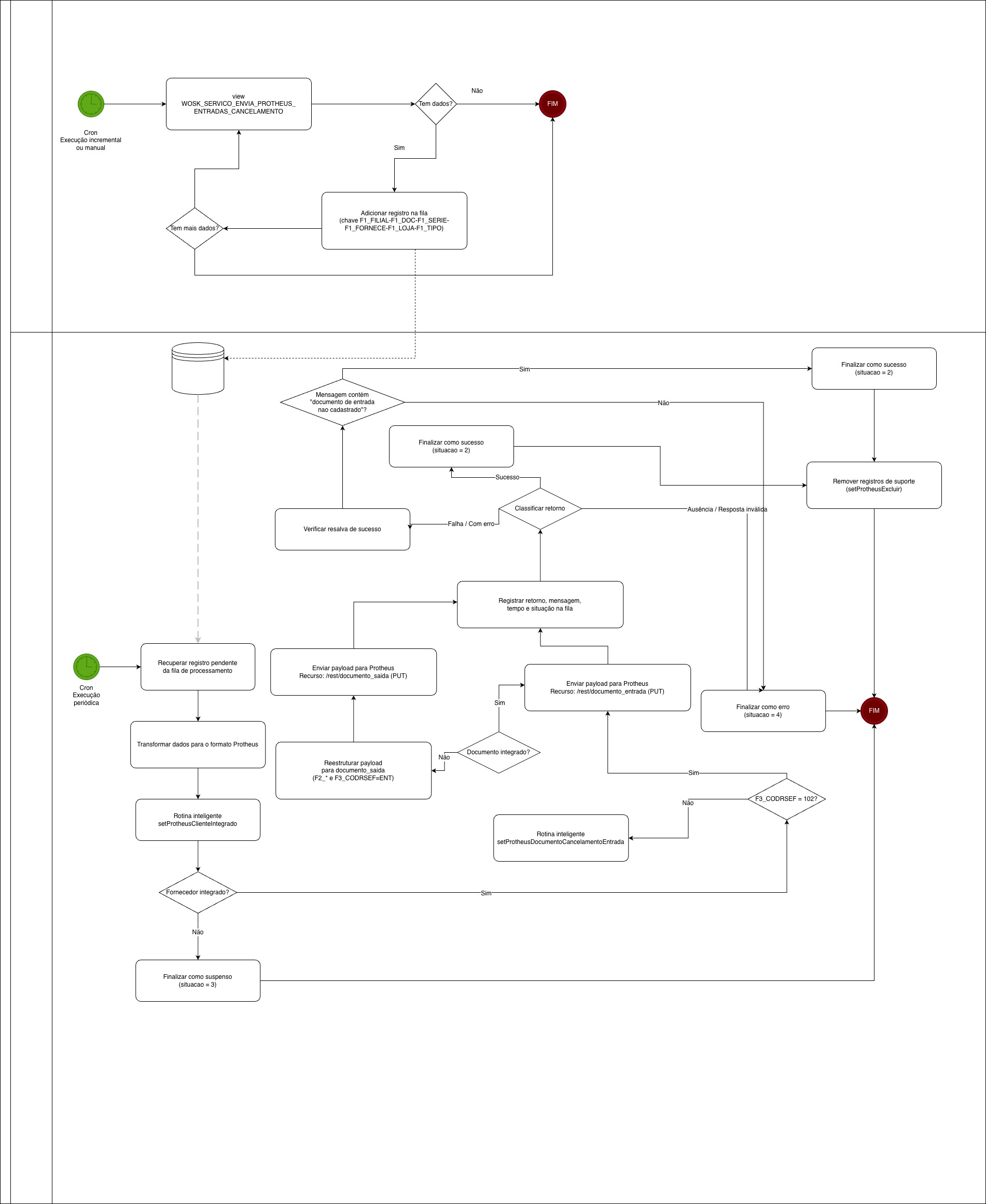 Em cenários de falha (ausência de resposta, retorno inválido/inesperado, presença de code ou Mensagem = ERRO), o registro é finalizado como erro e permanece registrado na fila de processamento com detalhes do retorno e mensagem, permitindo acompanhamento e reprocessamento conforme necessidade operacional.