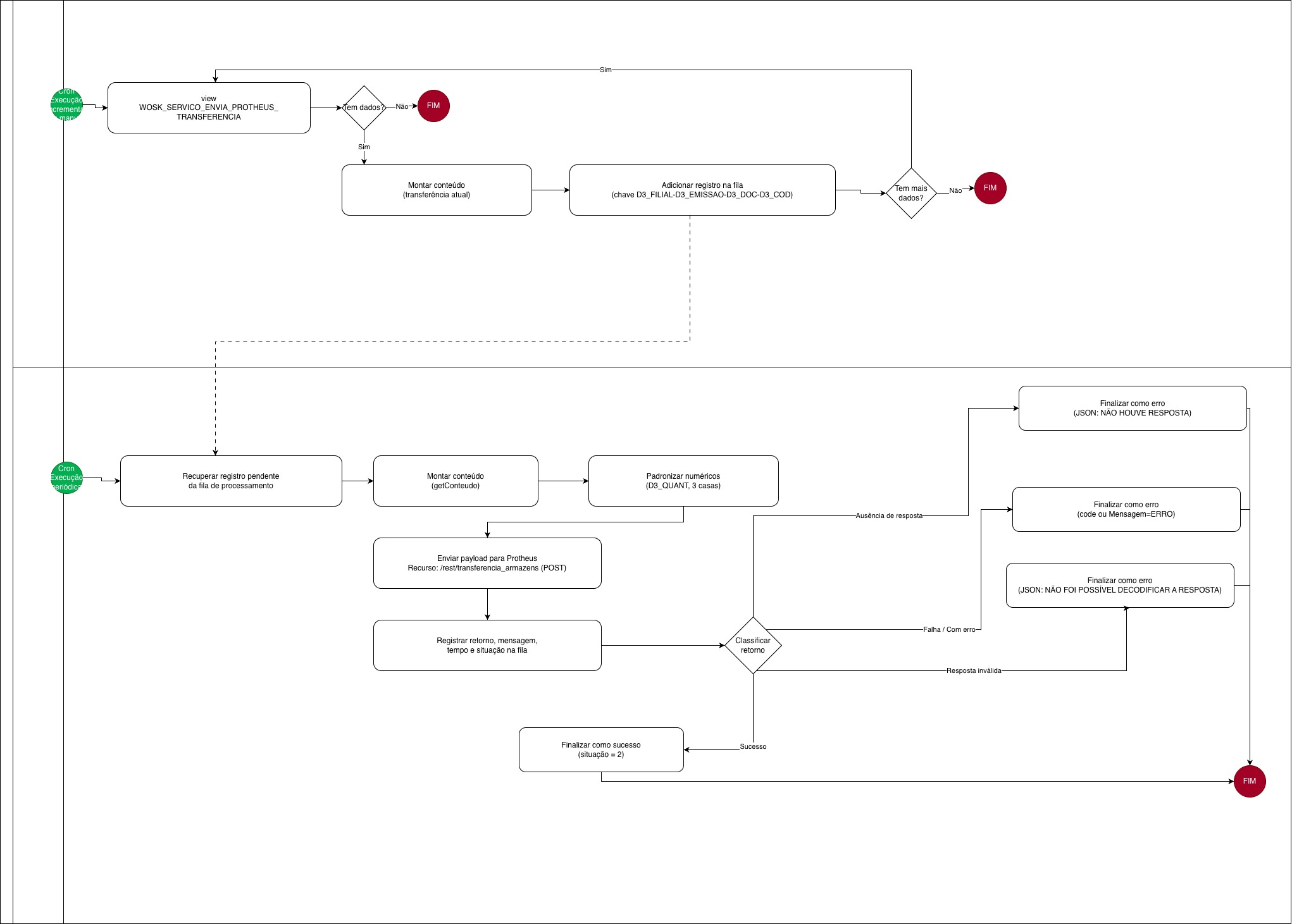 Leitura: consulta a view WOSK_SERVICO_ENVIA_PROTHEUS_TRANSFERENCIA para obter o registro atual de transferência e encaminhar para processamento assíncrono.