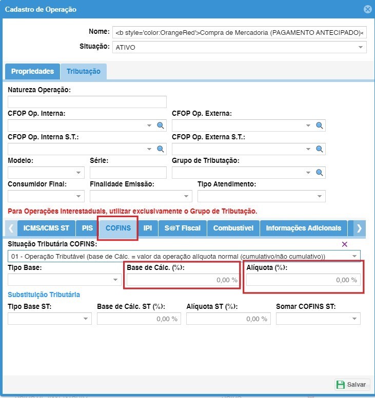 8 - Valor da COFIN , selecionar o campo Tipo Base, antes de preencher Base de cálc.(%) e Alíquota(%)
