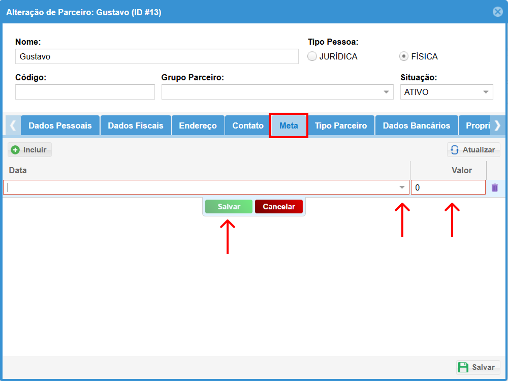 - Na tela de Alteração de parceiro, navegue até a aba Meta. Nessa aba, você encontrará as ferramentas para definir e gerenciar as metas do parceiro.