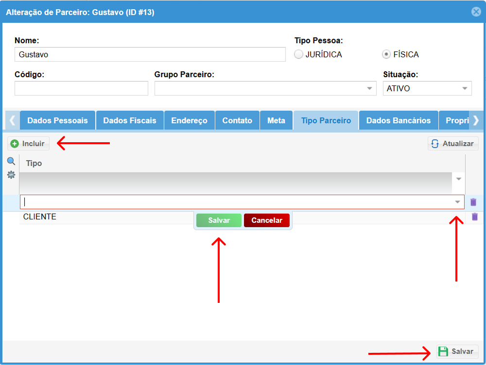 - Por fim, clique no botão "Salvar" (representado por um disquete) para gravar todas as informações no parceiro.