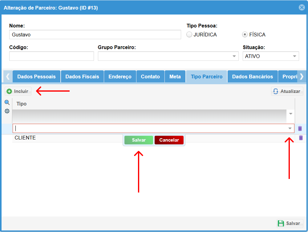 - Tipo de Parceiro: Para definir metas para lojas, é necessário que o TIPO PARCEIRO do parceiro selecionado seja do tipo LOJA.