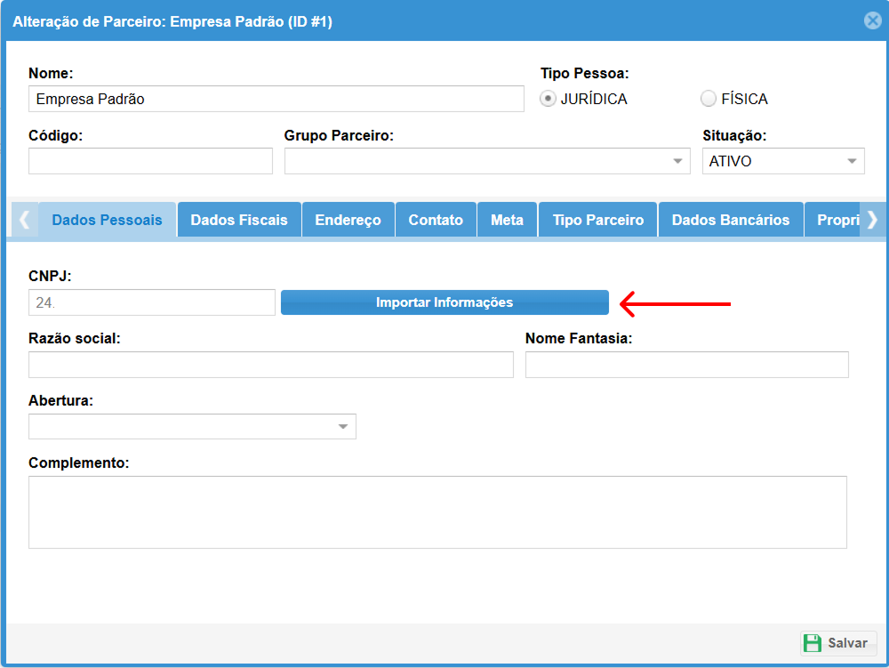 - Após clicar em Salvar, os campos adicionais para o cadastro do parceiro jurídico serão liberados.