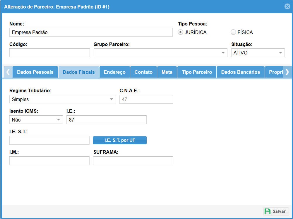 - Isento ICMS: Se a empresa do parceiro jurídico possuir Inscrição Estadual, selecione a opção Não neste campo.