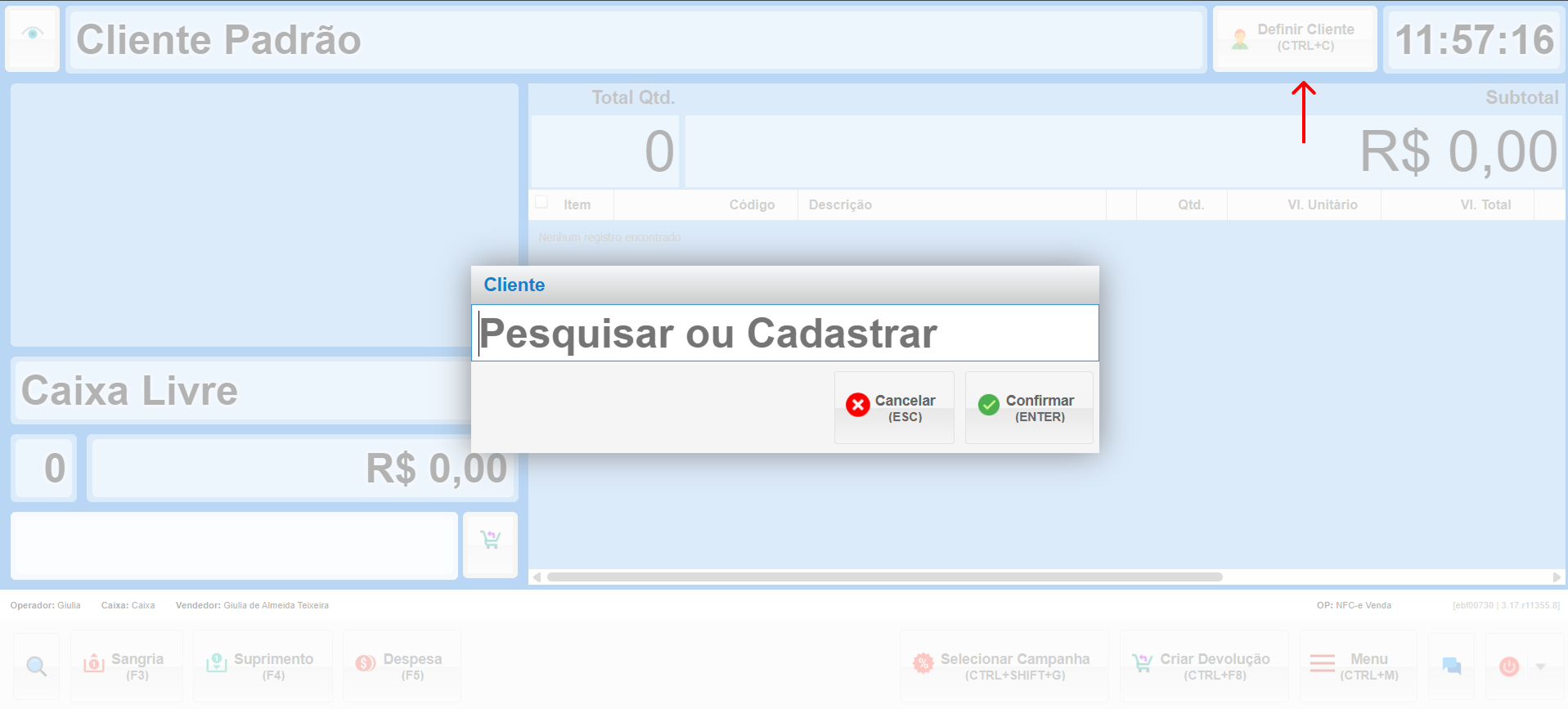 - No PDV, selecione a opção DEFINIR CLIENTE.