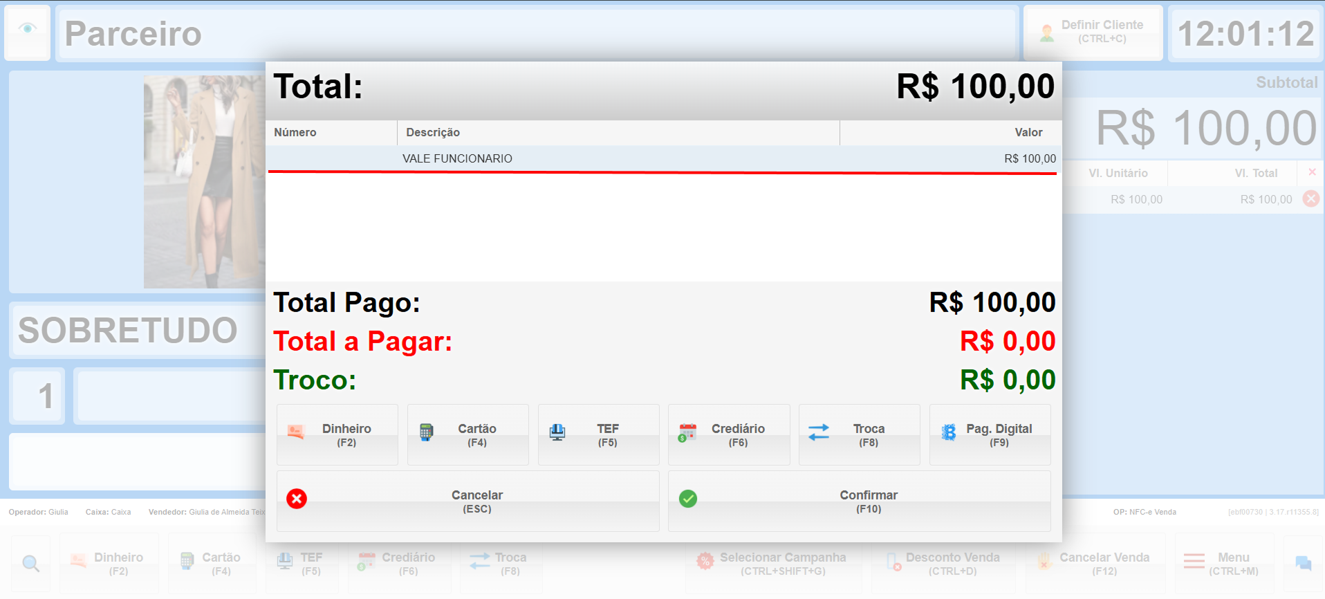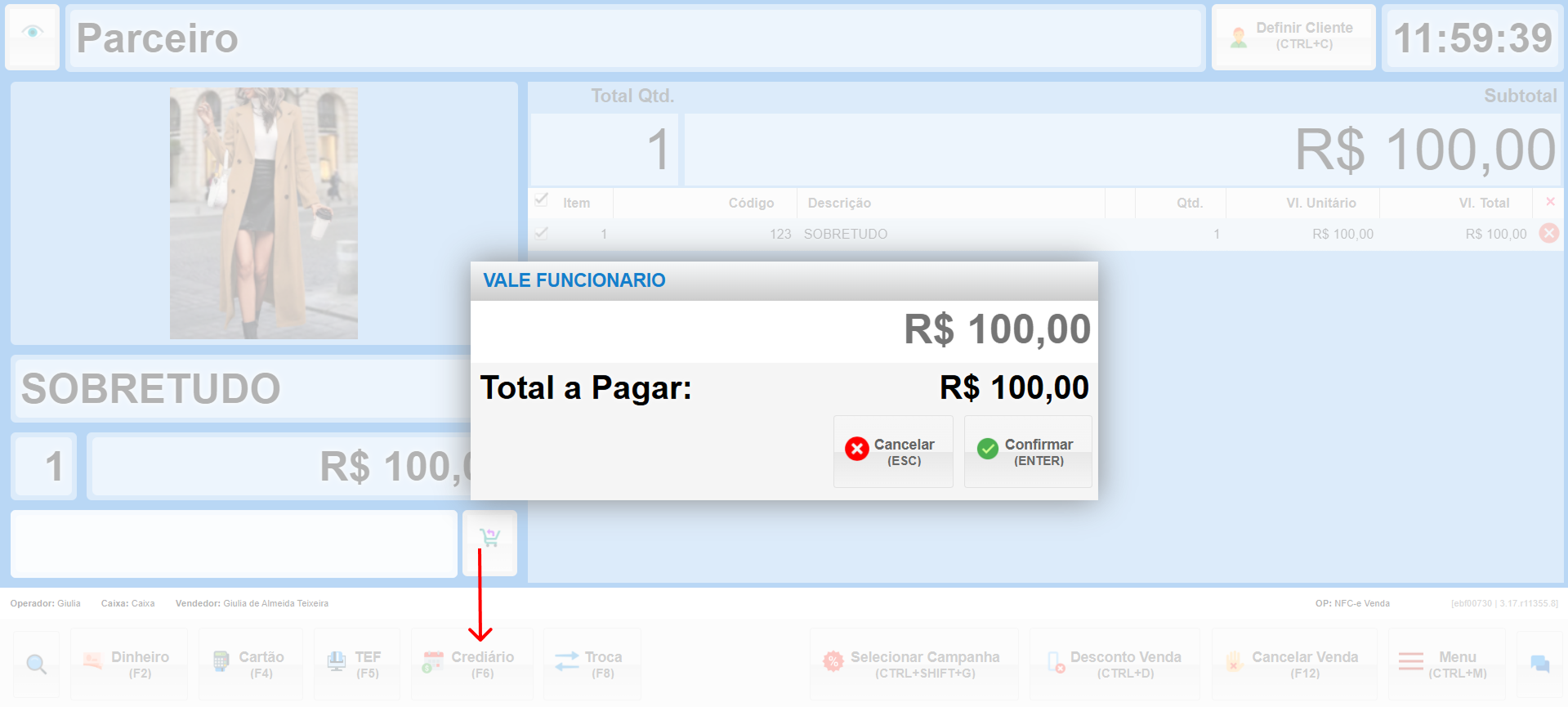 - Na caixa de diálogo que se abrir, digite o nome do funcionário cadastrado e clique em Confirmar.