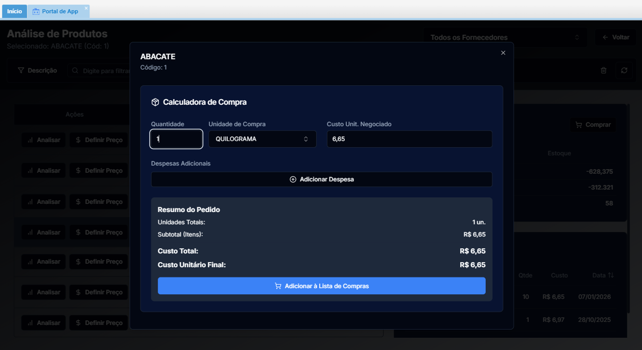 - Custo Unit. Negociado: O valor unitário que você conseguiu com o fornecedor.