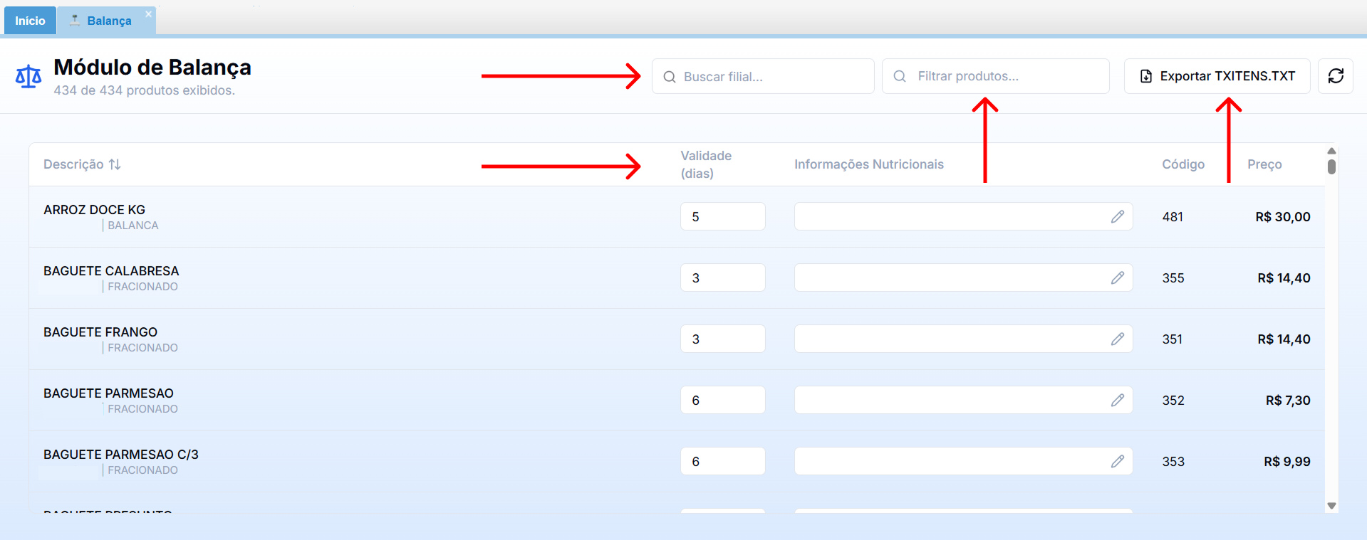 - Exportar TXITENS.TXT: Botão que exporta o arquivo para que seja importado no software da balança.