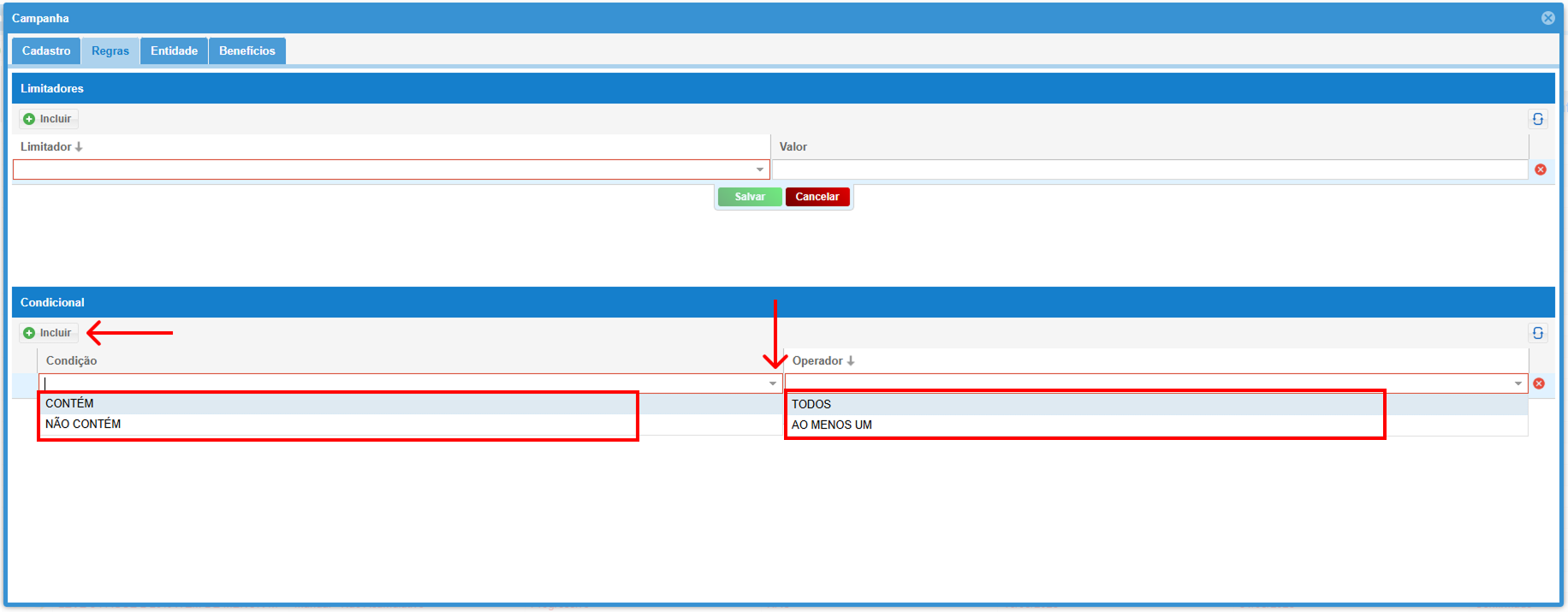 Quando a Condição é "Não Contém" e o Operador é "Todos", a campanha será aplicada somente se nenhum dos itens especificados estiver presente na venda.