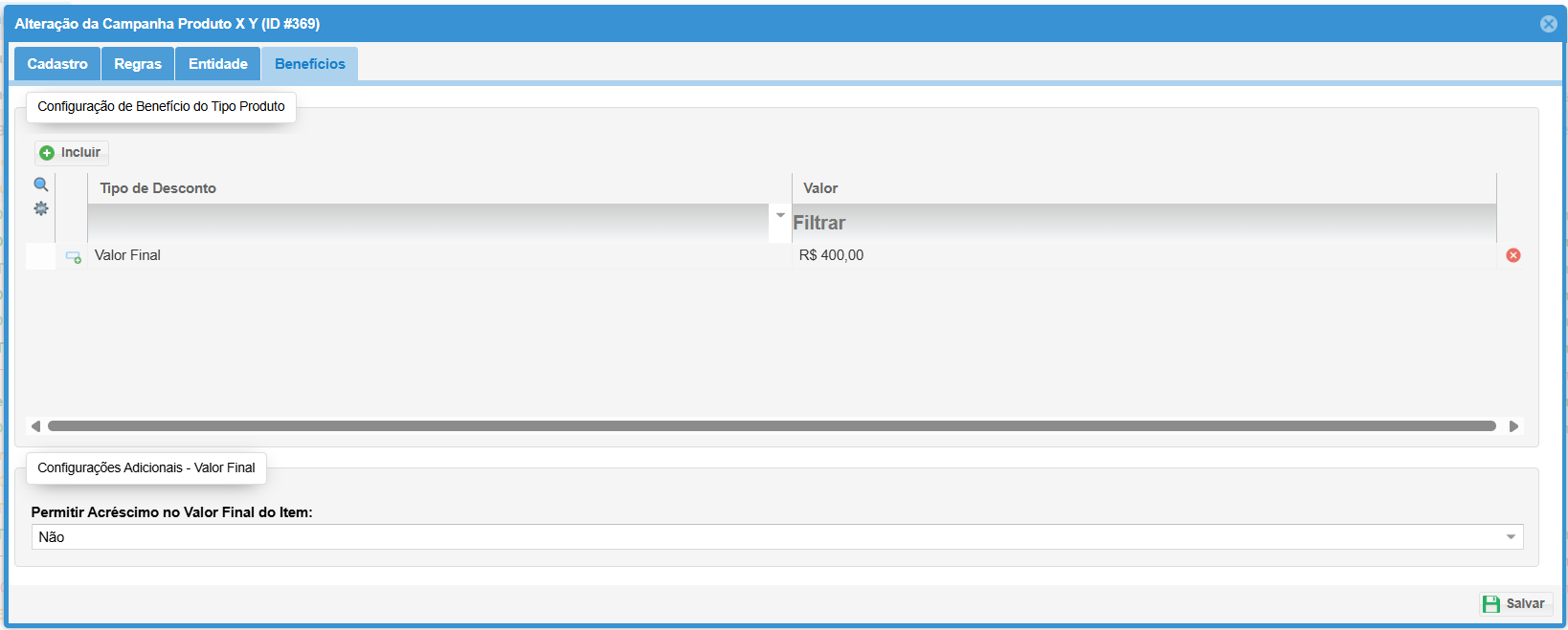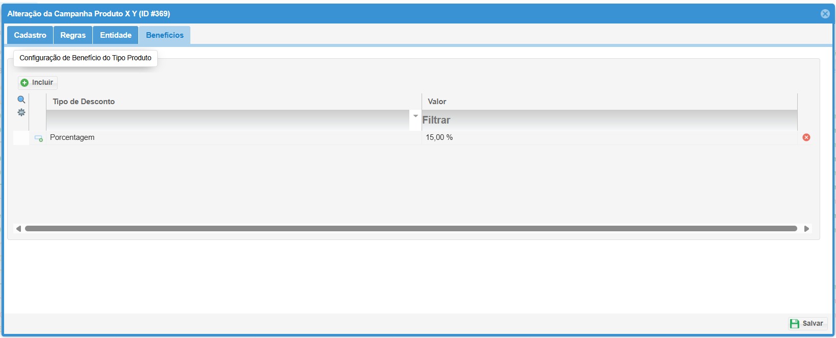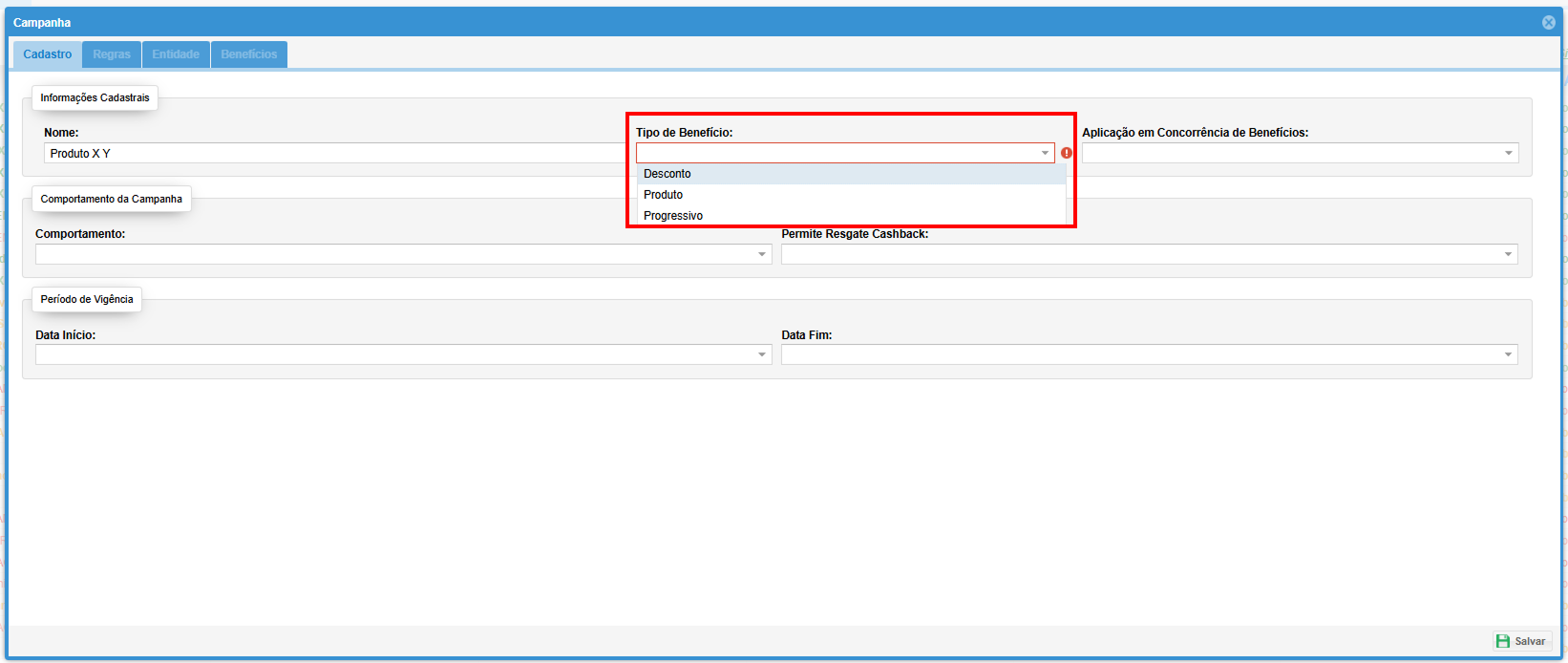 Na aba de Benefícios, você configura os detalhes do benefício que será oferecido na campanha. Os campos disponíveis variam de acordo com o "Tipo de Benefício" selecionado na aba Cadastro.
