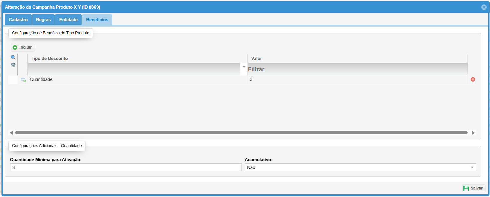 - Quantidade Mínima: Define a quantidade mínima de produtos daquela marca/categoria/etc. que devem estar presentes na venda para ativar a campanha.