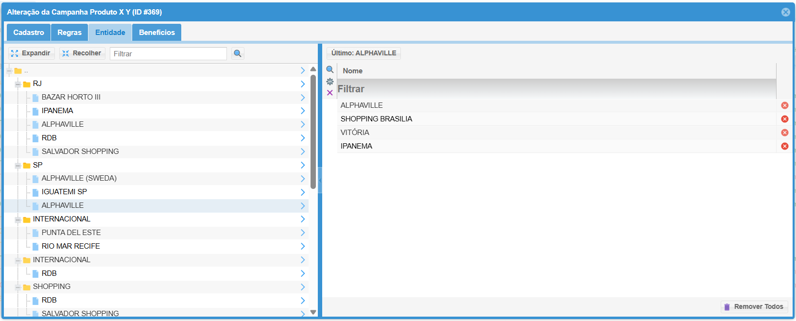 - Utilize o botão Remover Todos para remover todas as entidades selecionadas de uma vez.