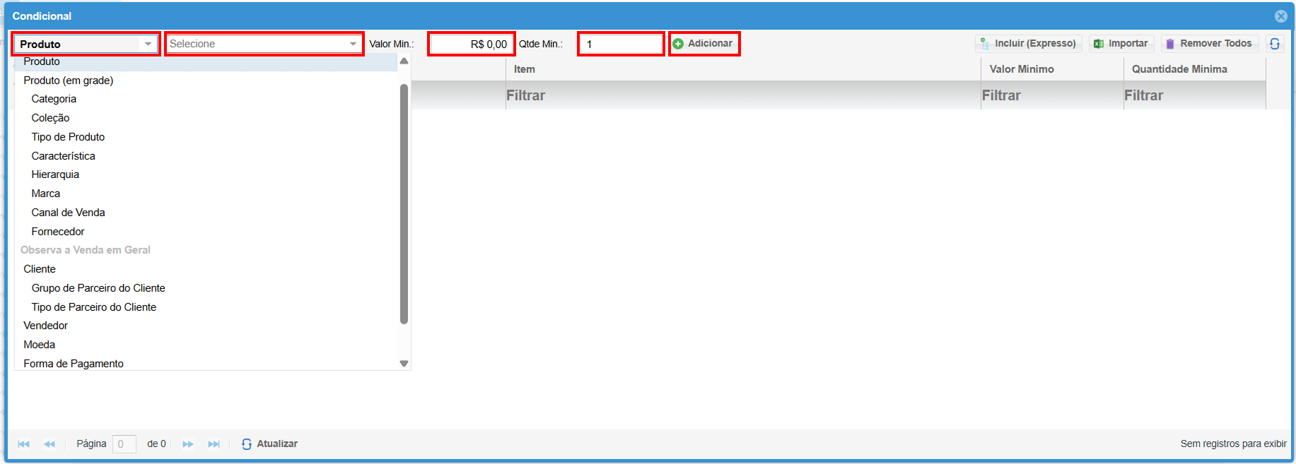 Valor Mínimo de Venda: Estabelece valor mínimo de compra para ativar a promoção.