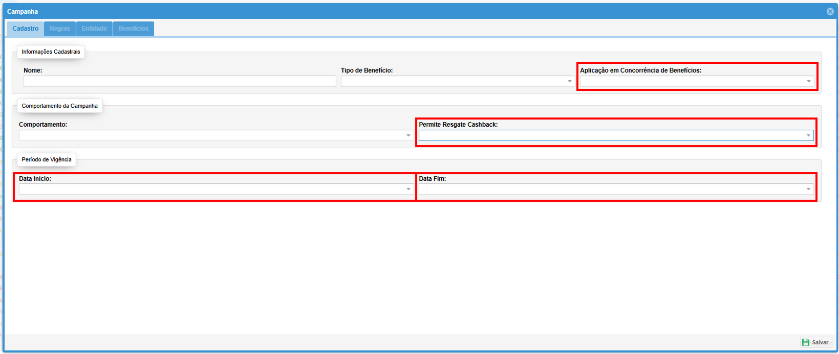 - Permite Resgate Cashback: Define se a campanha permite o resgate de cashback (valor que volta para o cliente).