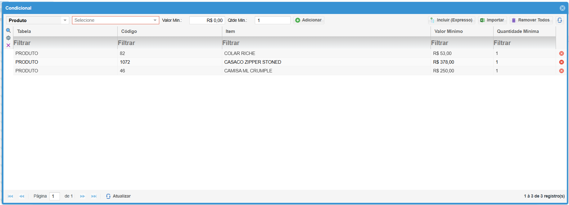 - Quantidade: Permite que você selecione uma determinada quantidade para que o desconto passe a valer a partir de um número de peças na venda.
