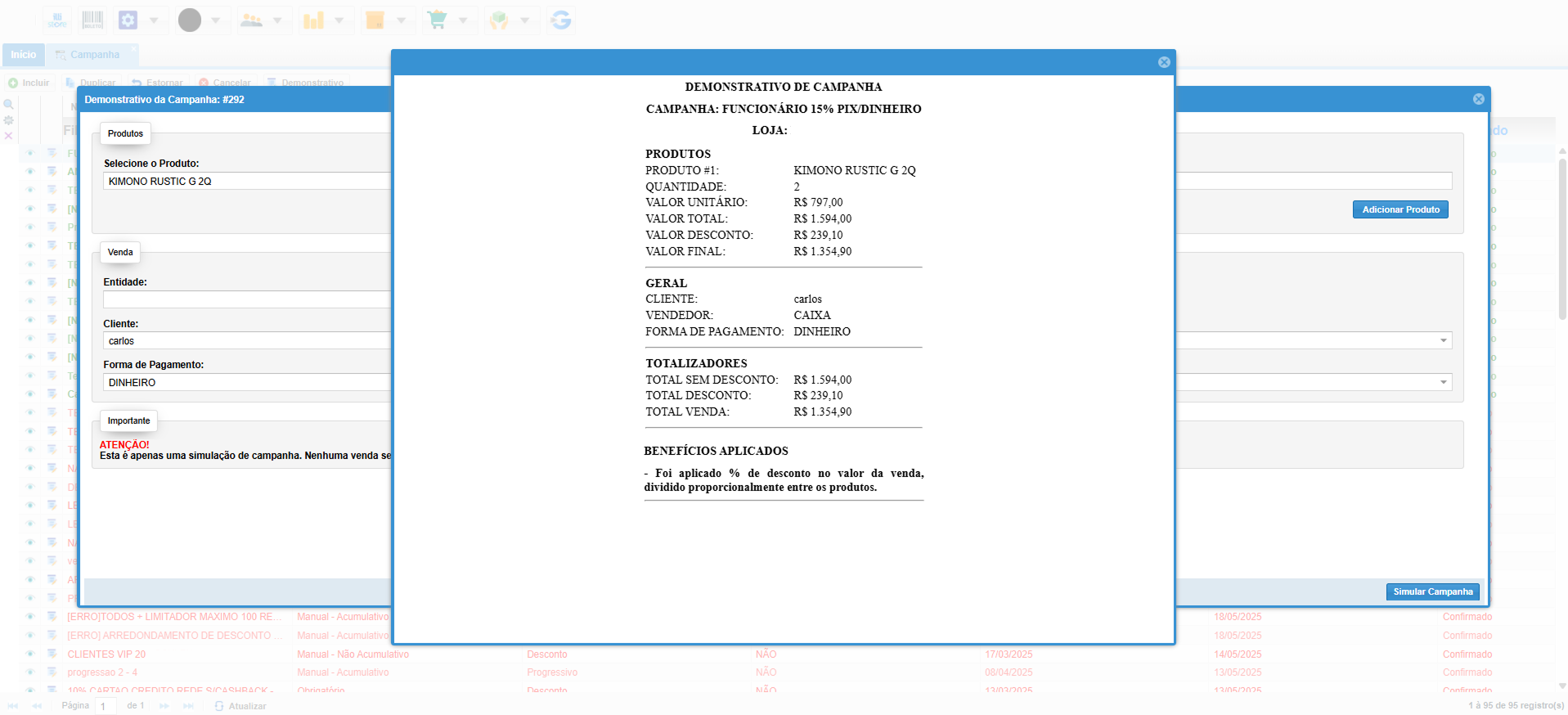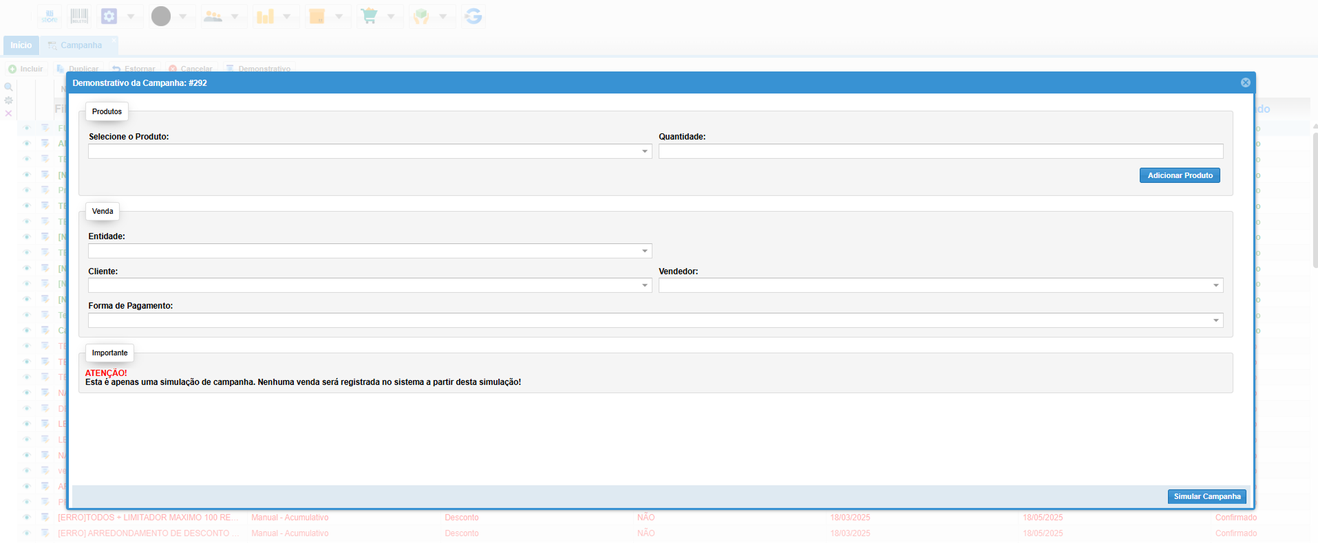 - Demonstrativo: Consegue simular o uso de uma campanha ativa, sem ficar com uma venda registrada.