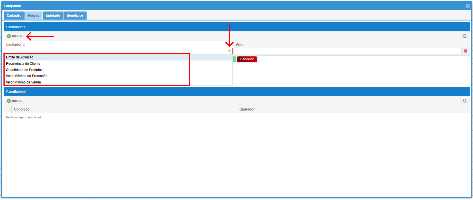 - Vá em Limitador e clique em Incluir. Selecione o limitador que desejar para sua campanha