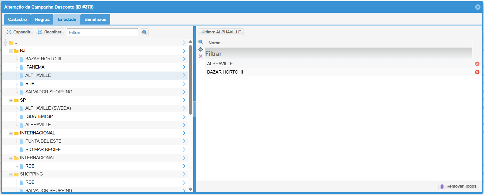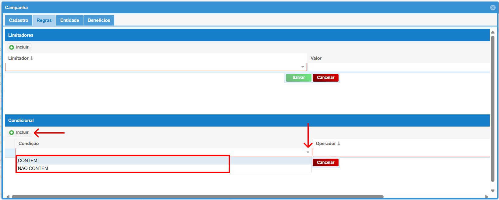 Quando a Condição é "Não Contém" e o Operador é "Todos", a campanha será aplicada somente se nenhum dos itens especificados estiver presente na venda.