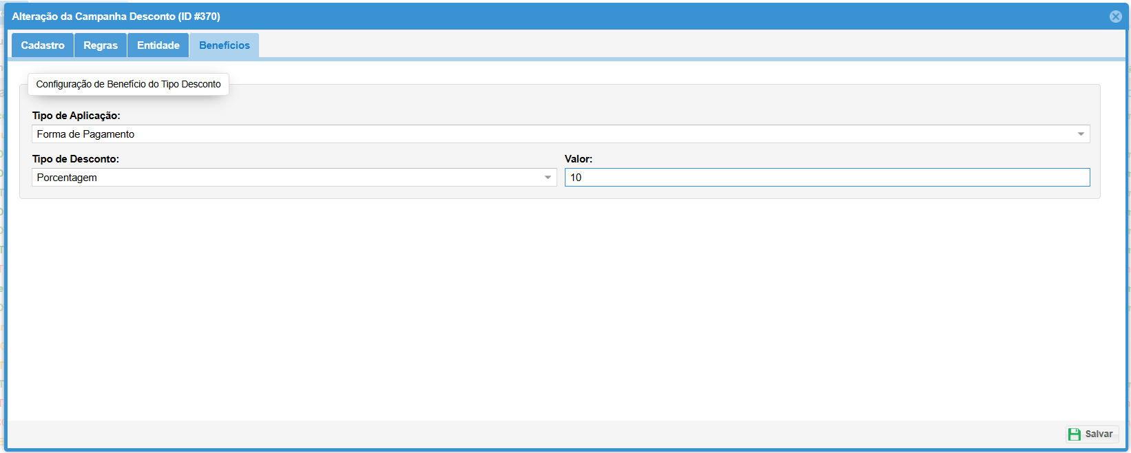 - Tipo de Benefícios: Informe o tipo "Desconto"