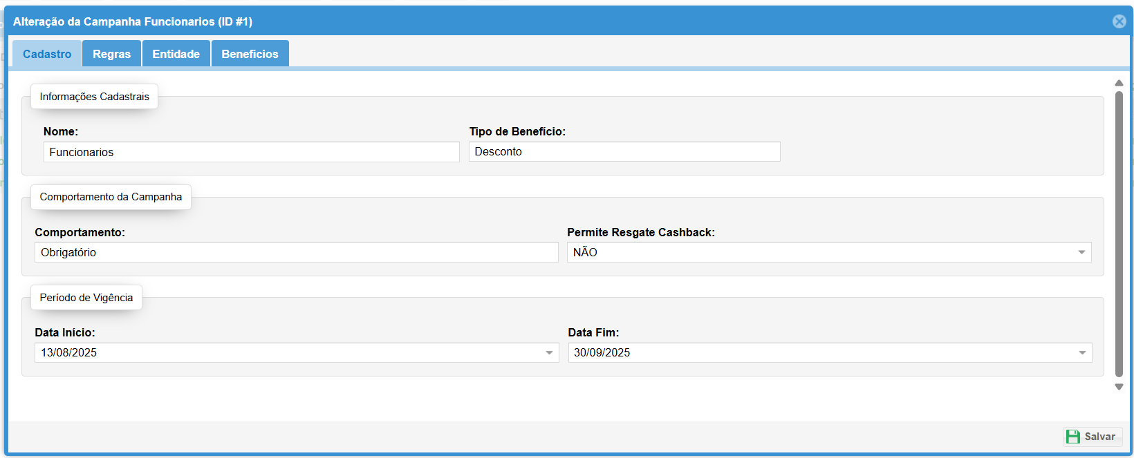 - Data início e Data Fim: Define o período de vigência da campanha.