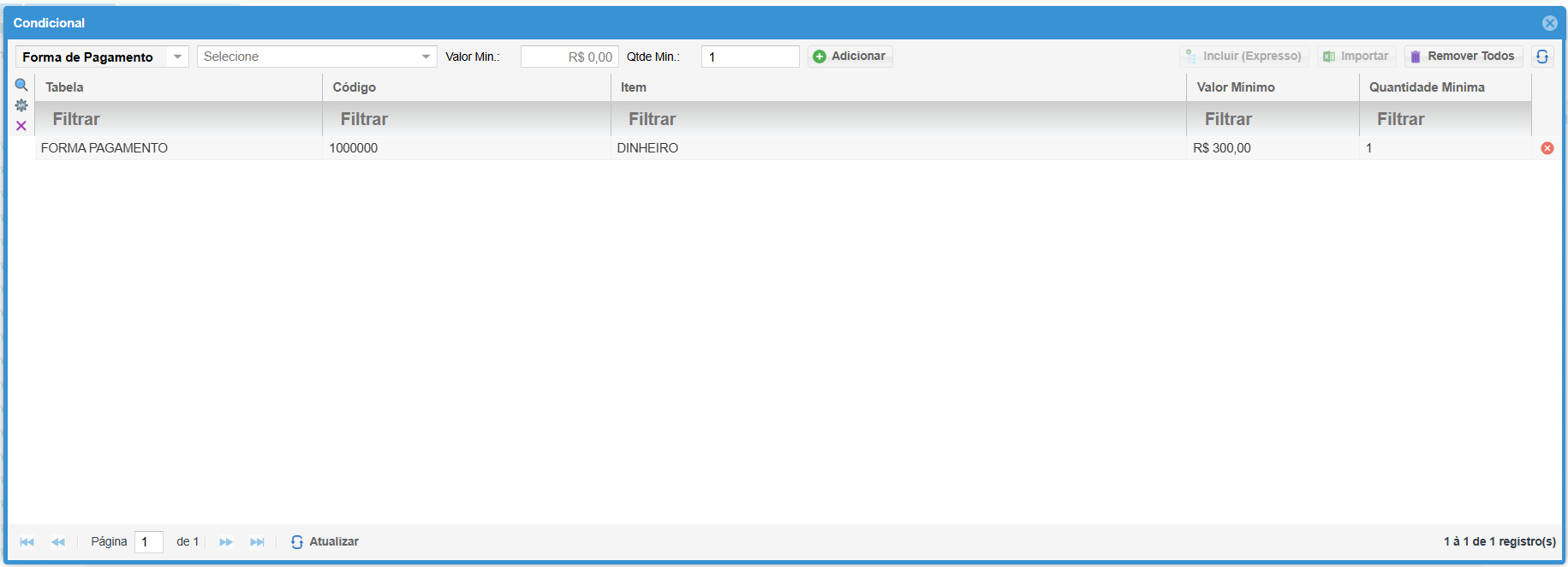 - No nosso caso, será um desconto pela forma de pagamento, selecione o tipo de pagamento informe o valor mínimo e adicione.