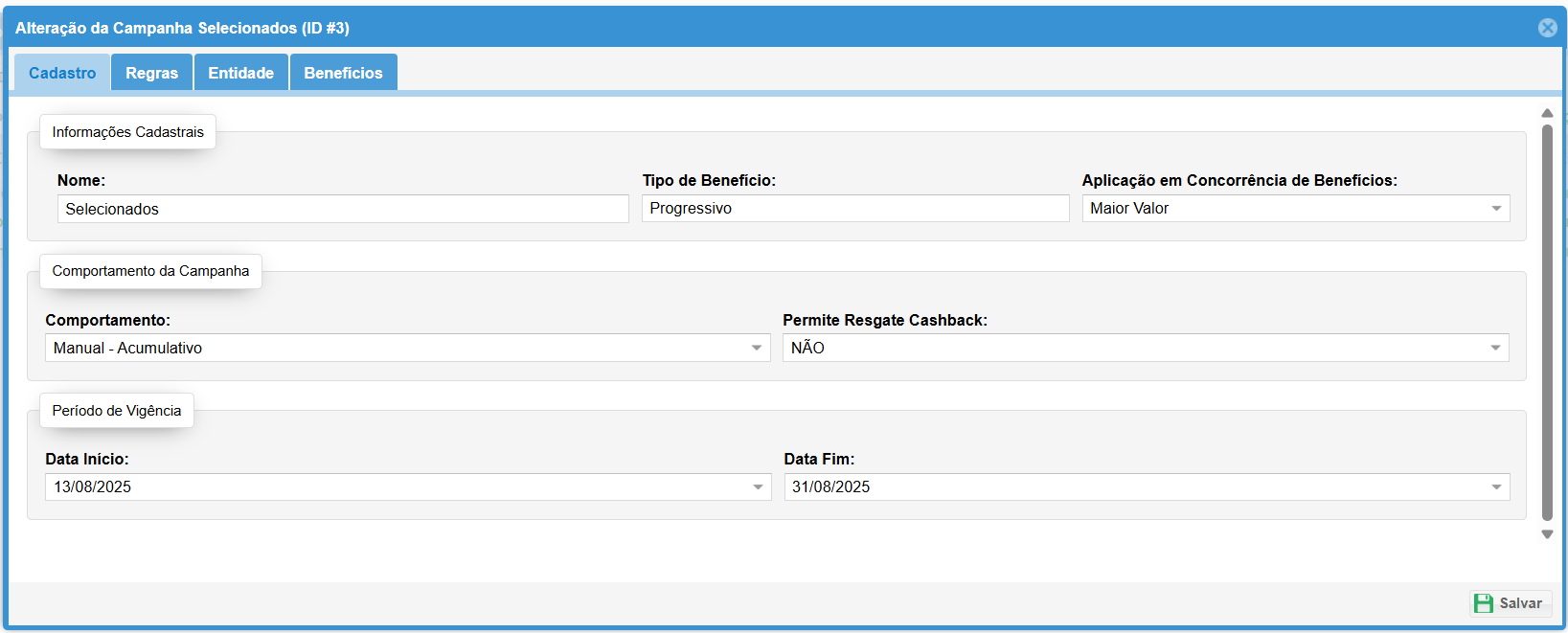 - Data início e Data Fim: Define o período de vigência da campanha.