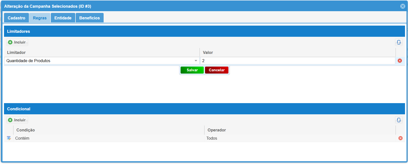 Quantidade de Produtos: Estabelece limite de itens que receberão o benefício.