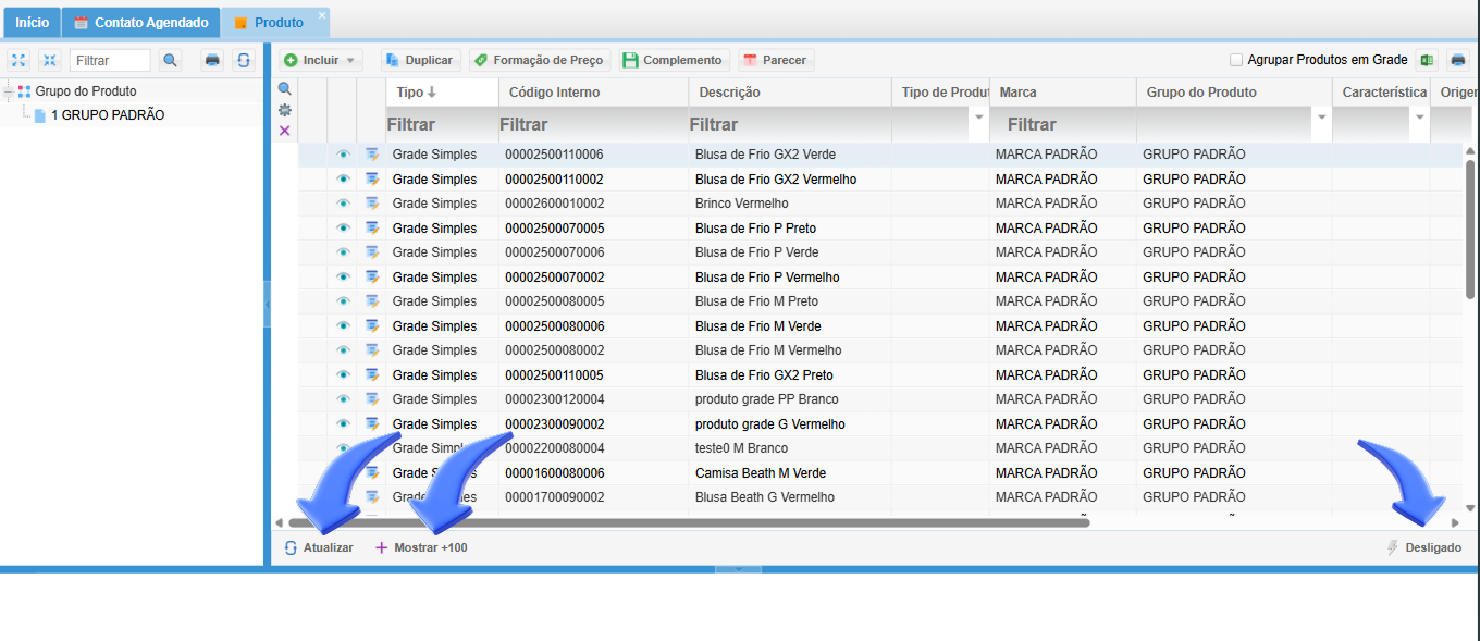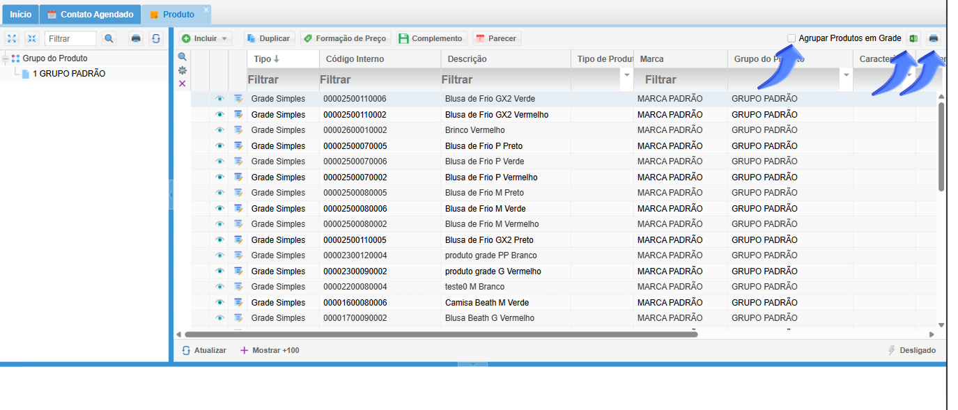 • Agrupar Produtos em Grade: Ao ativar esta opção, o sistema organiza visualmente os produtos que possuem variações, facilitando a conferência de itens que fazem parte da mesma família.