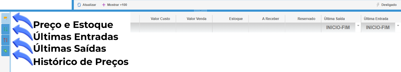 • +Mostrar +100: Use este botão para carregar mais produtos na tela de uma só vez, facilitando a navegação em estoques grandes.