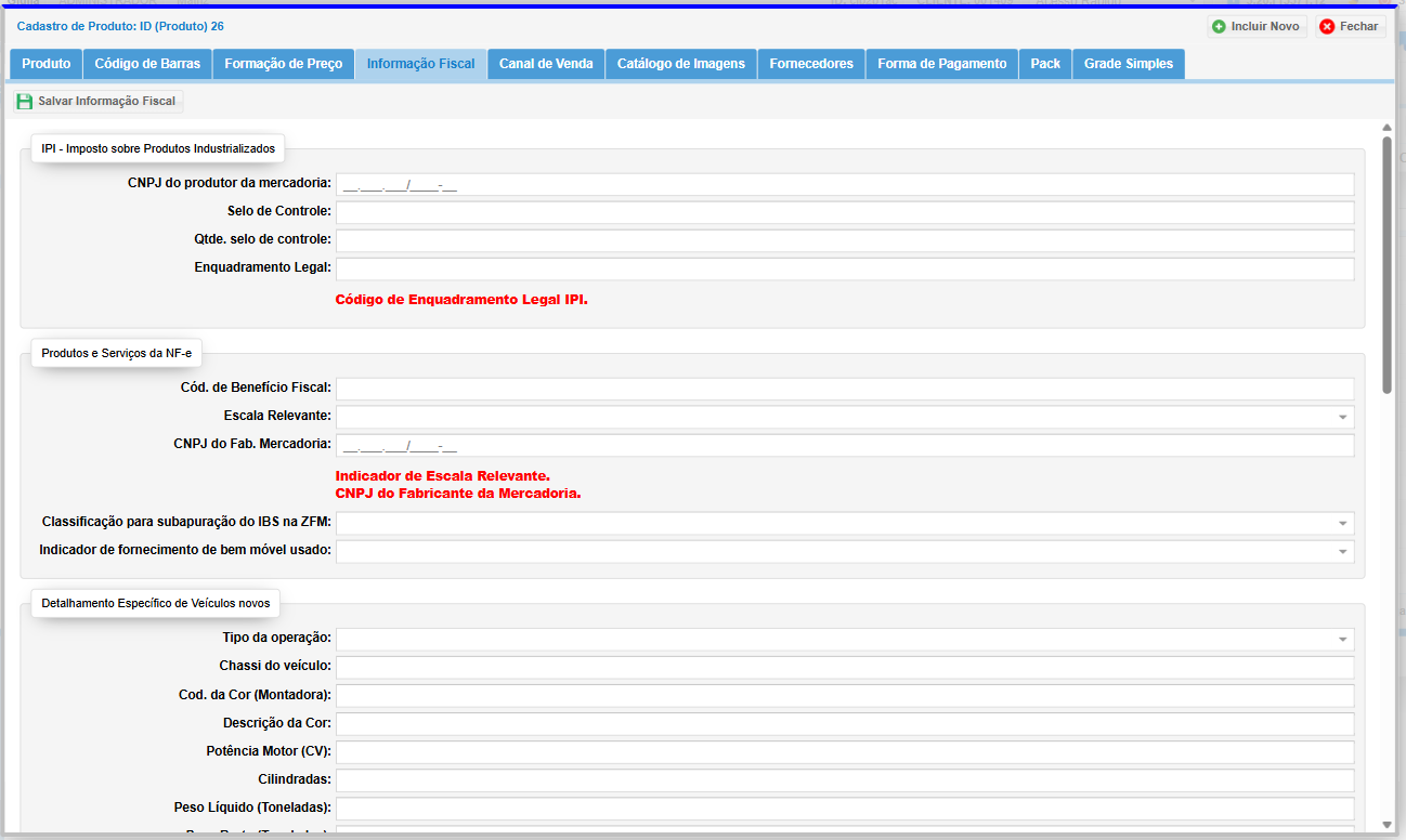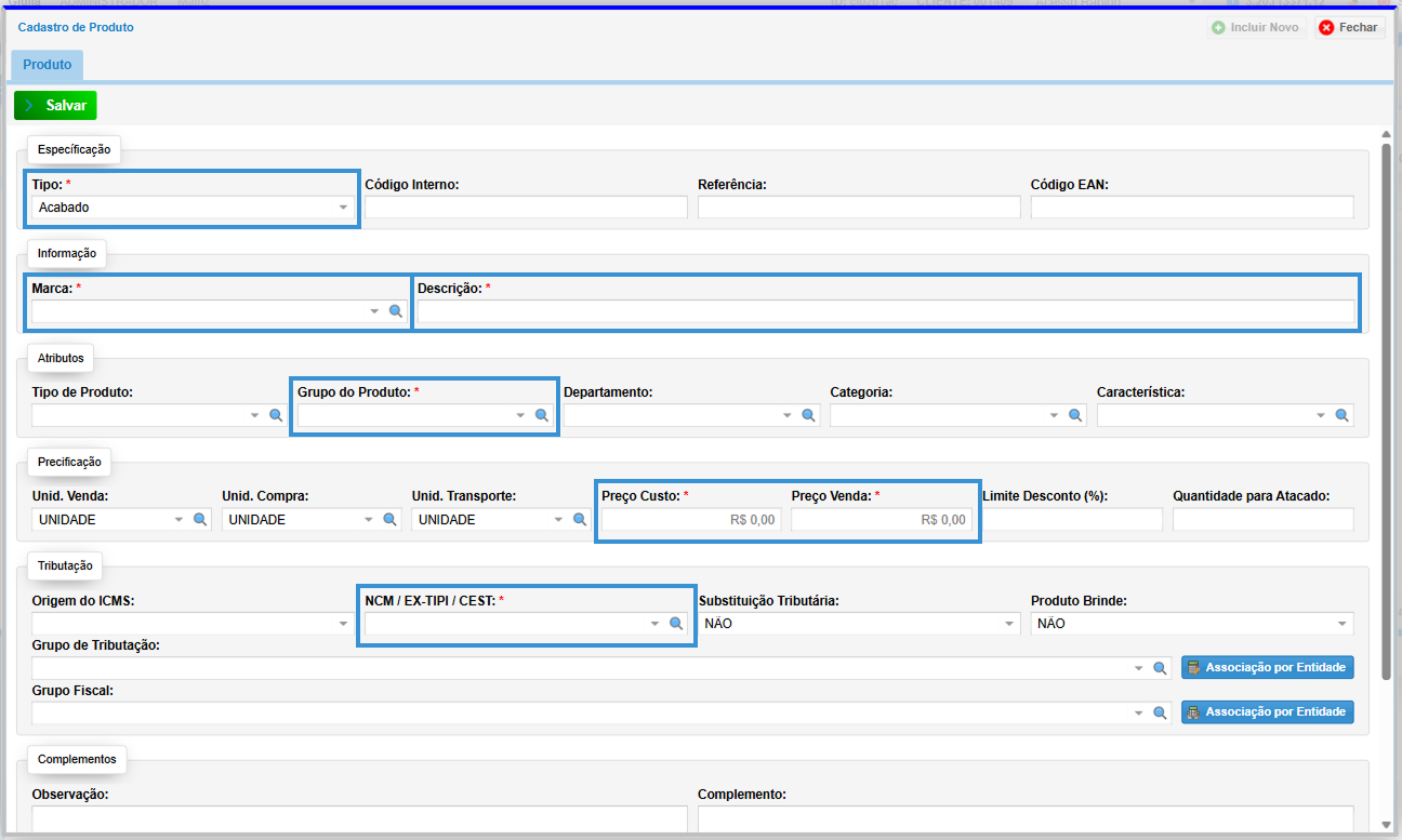 💡 Nota Importante: Os campos acima são os fundamentais para o funcionamento básico. Os demais campos desta aba são opcionais, mas lembre-se: quanto mais informações você cadastrar, mais completo o seu produto estará, facilitando buscas futuras e a organização do seu catálogo.