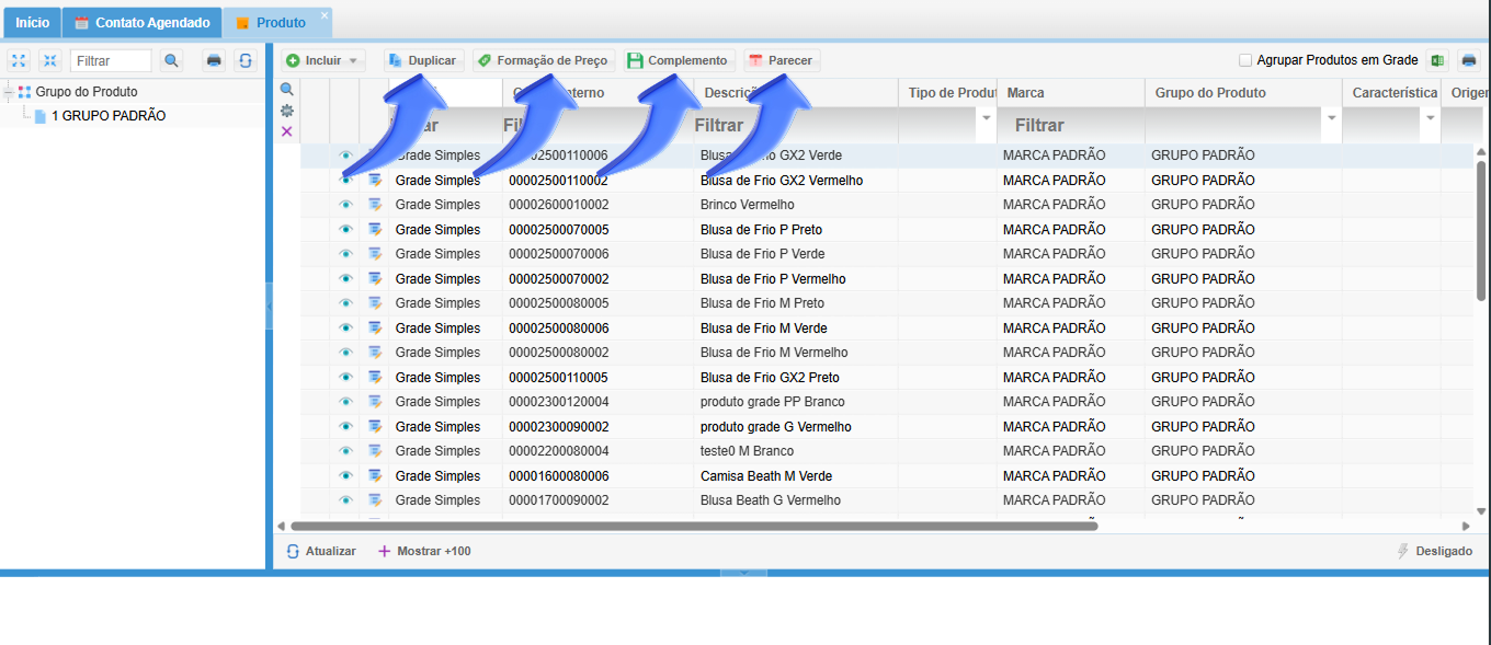 • Ao selecionar um produto na lista, você utilizará estes botões (localizados no canto superior da grade) para realizar as principais ações: