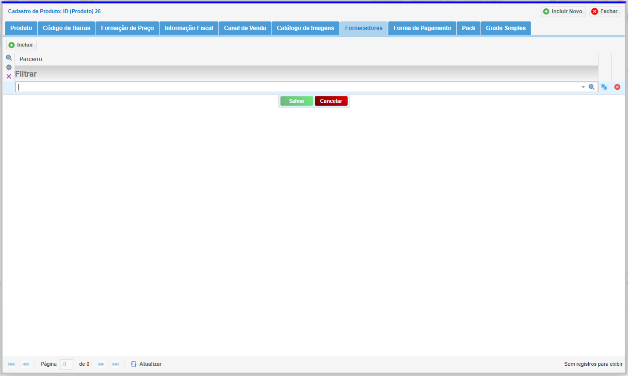 • Cadastro Completo (Formulário): Para um cadastro detalhado, clique no botão Incluir (ícone de "+" verde no canto superior esquerdo). Isso abrirá uma janela com diversas abas específicas.