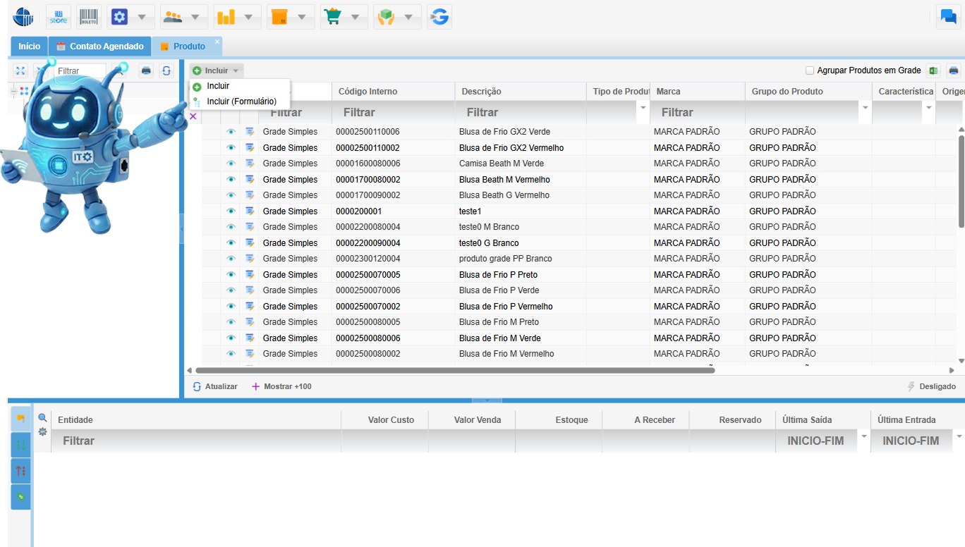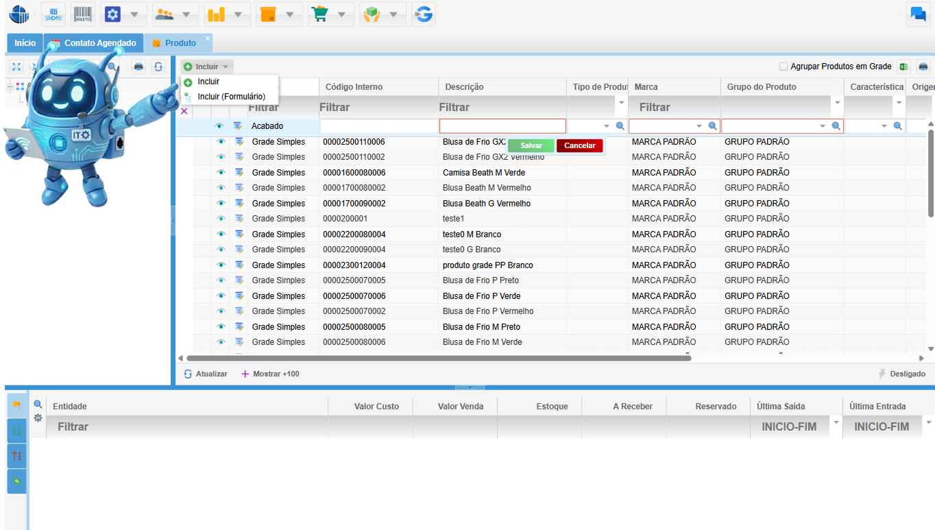• Cadastro em Linha: Permite preencher campos básicos (como Descrição e Preço) diretamente na grade da tela principal, ideal para registros rápidos.