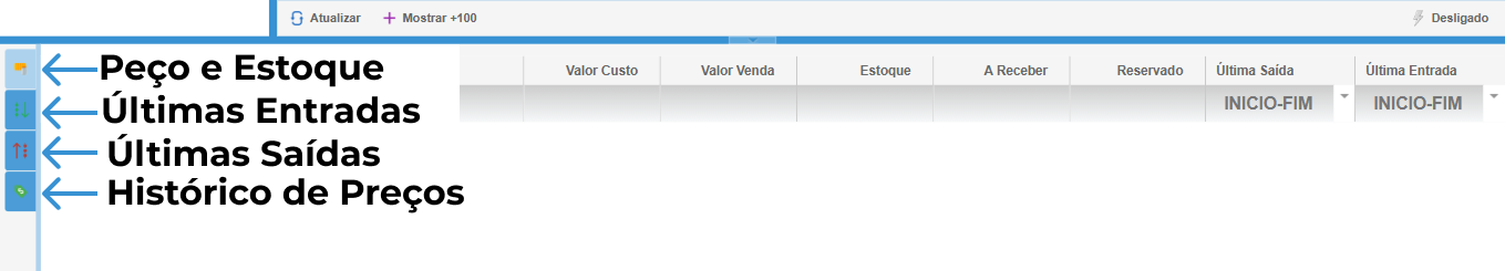 +Mostrar +100: Use este botão para carregar mais produtos na tela de uma só vez, facilitando a navegação em estoques grandes.