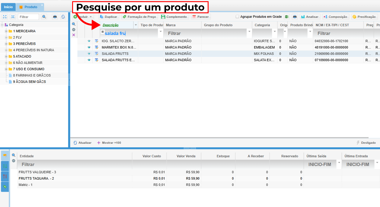 - Na tela de listagem, procure pelo produto que você deseja transformar em composto (exemplo: "Salada de Fruta") e selecione-o.