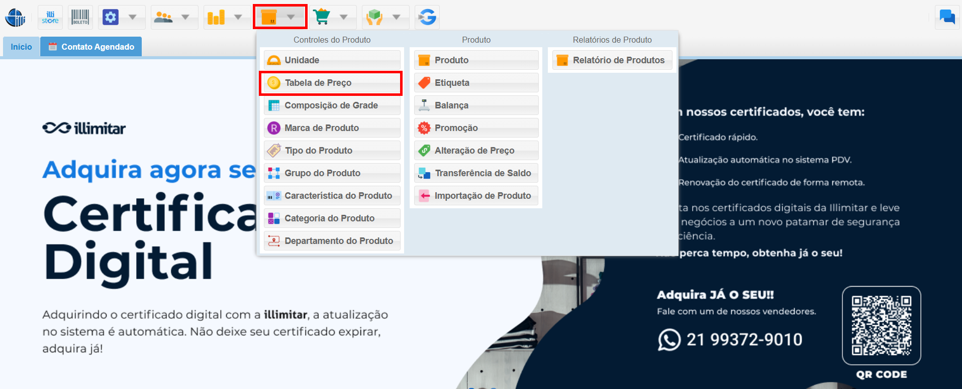 - No menu Clique no ícone Produto e selecione a opção Tabela de Preço.
