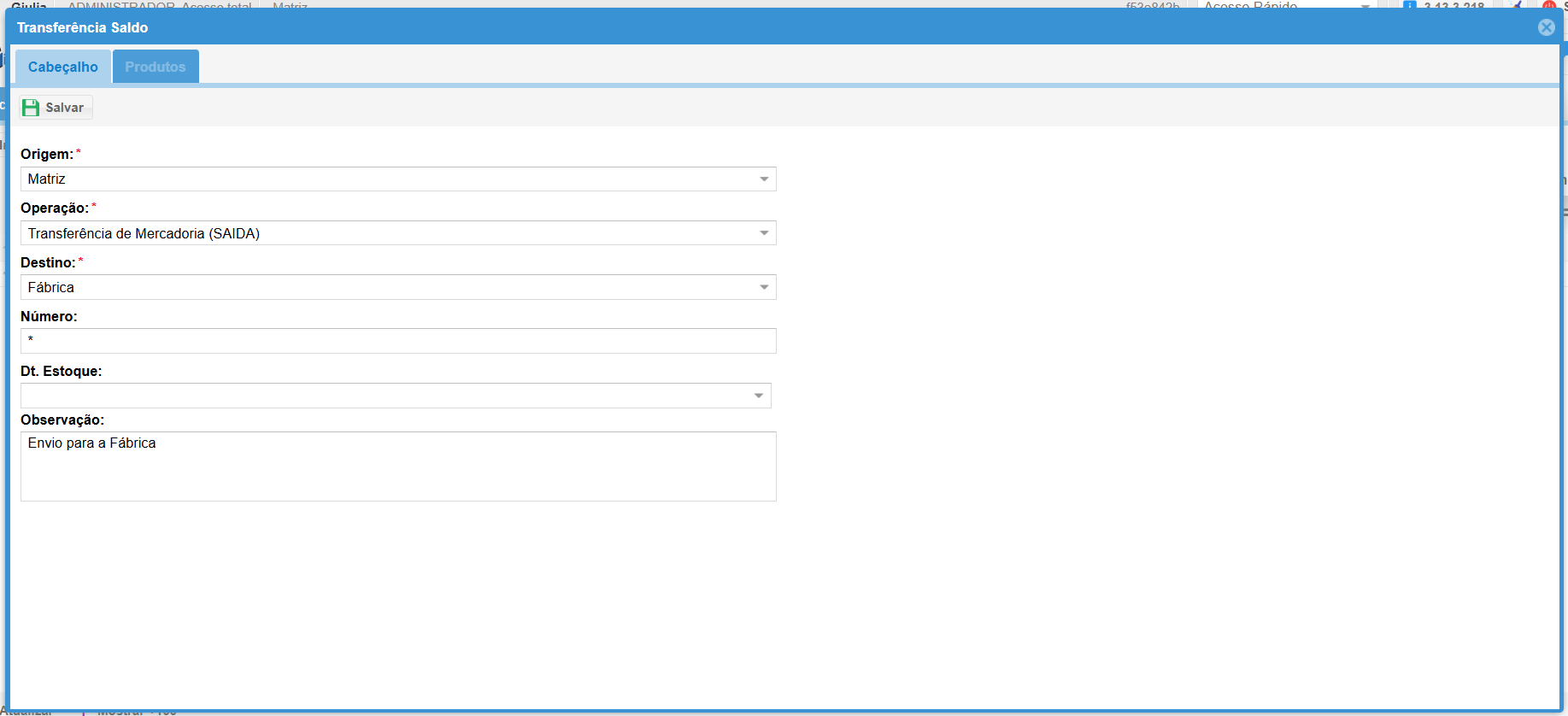 - Data Estoque: Informe a data da transferência, utilizada para controle de estoque.