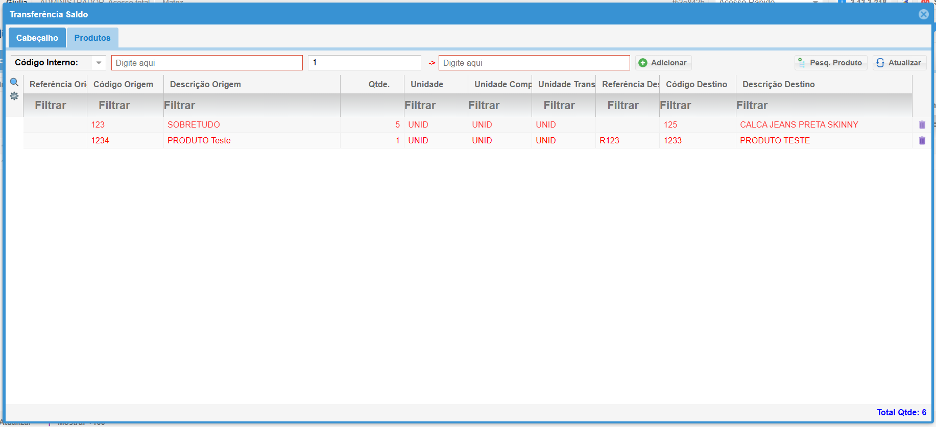 4. Adicione os Produtos a serem Transferidos: