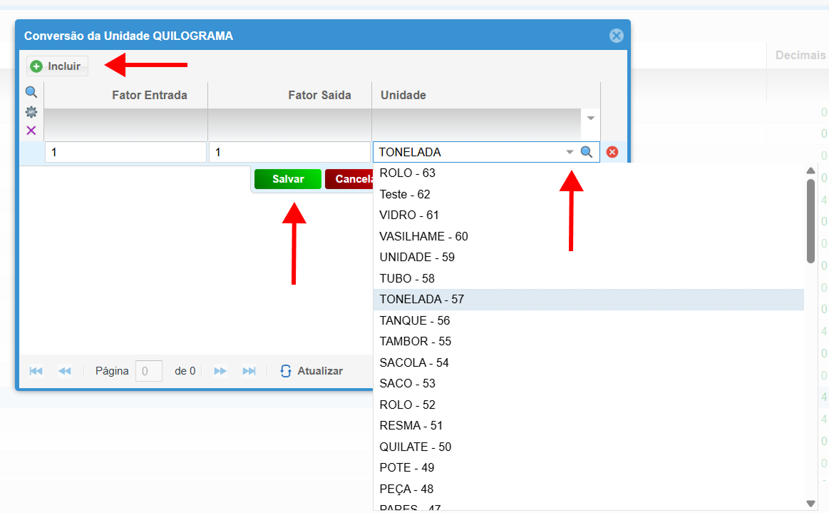 - Na tela do módulo Unidade, selecione a função Conversão de Unidade. Clique em Incluir.