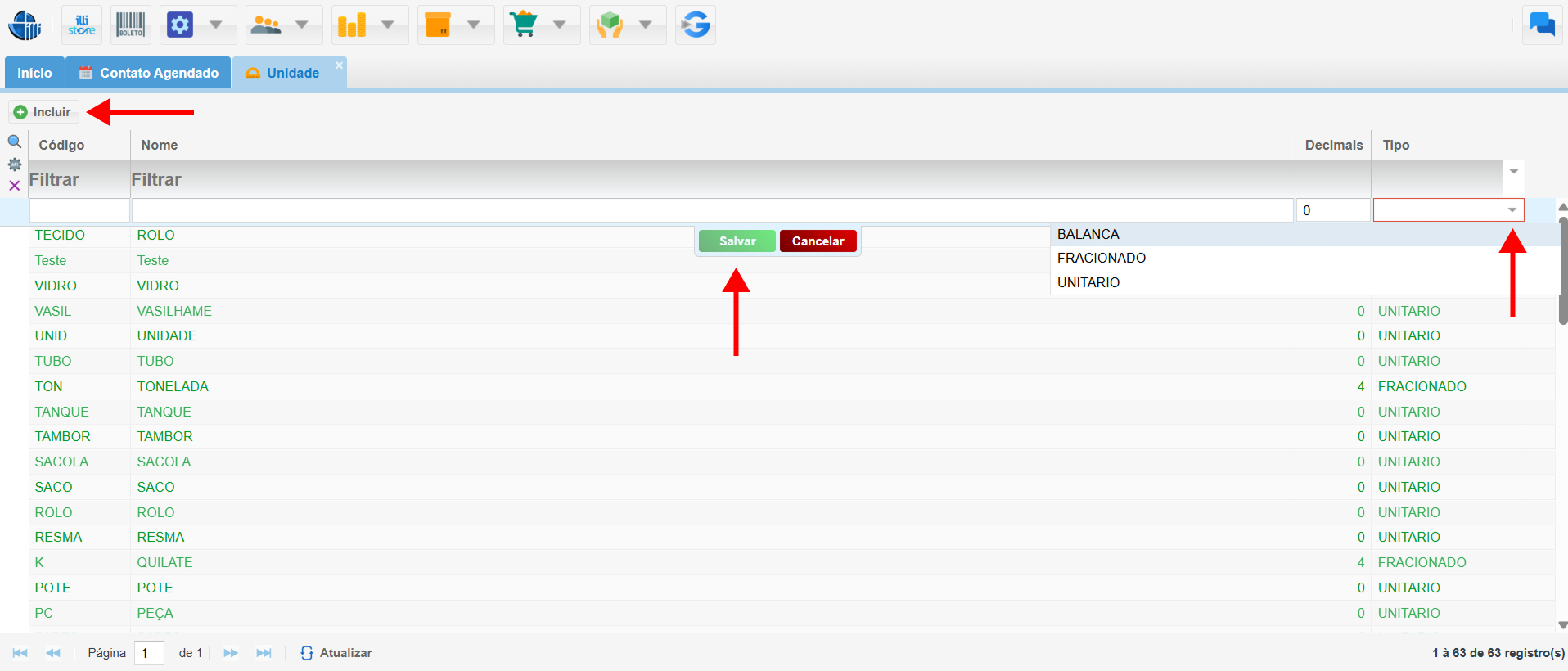 - Clique no botão Salvar para cadastrar a nova unidade de medida.
