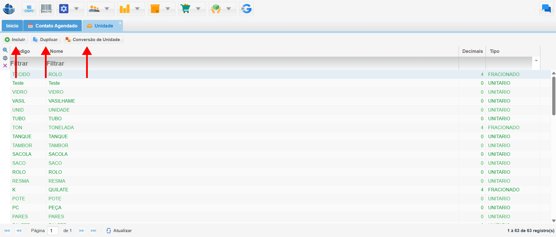 - Duplicar: Crie cópias de unidades de medida existentes para facilitar a criação de novas.