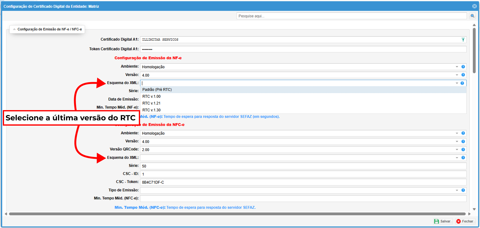 Nos campos Esquema de XML, altere a seleção para a versão: RTC. v1.30. Clique no botão Salvar para finalizar.