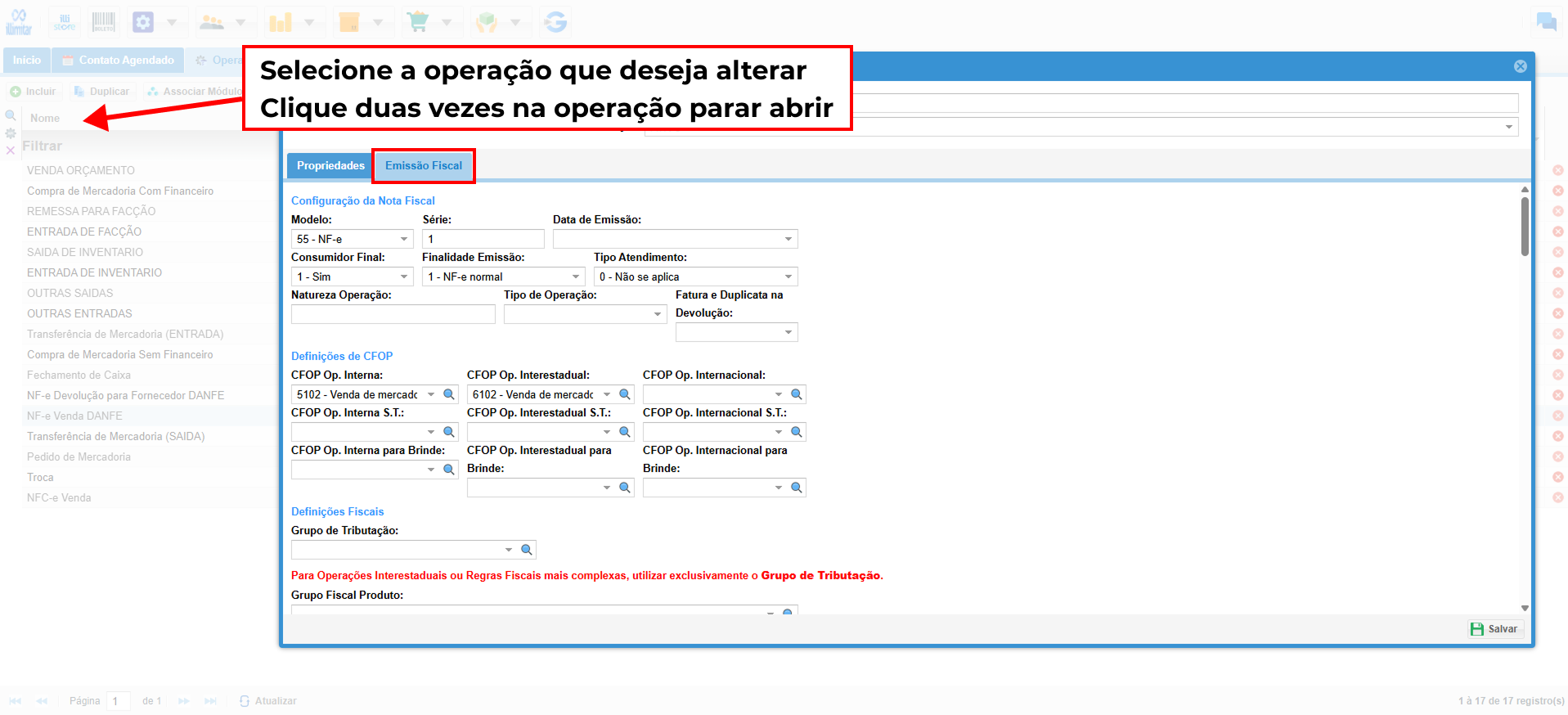 Para modificar a operação desejada, localize-a e dê um clique duplo. Isso abrirá a operação, permitindo o acesso à aba Emissão Fiscal.